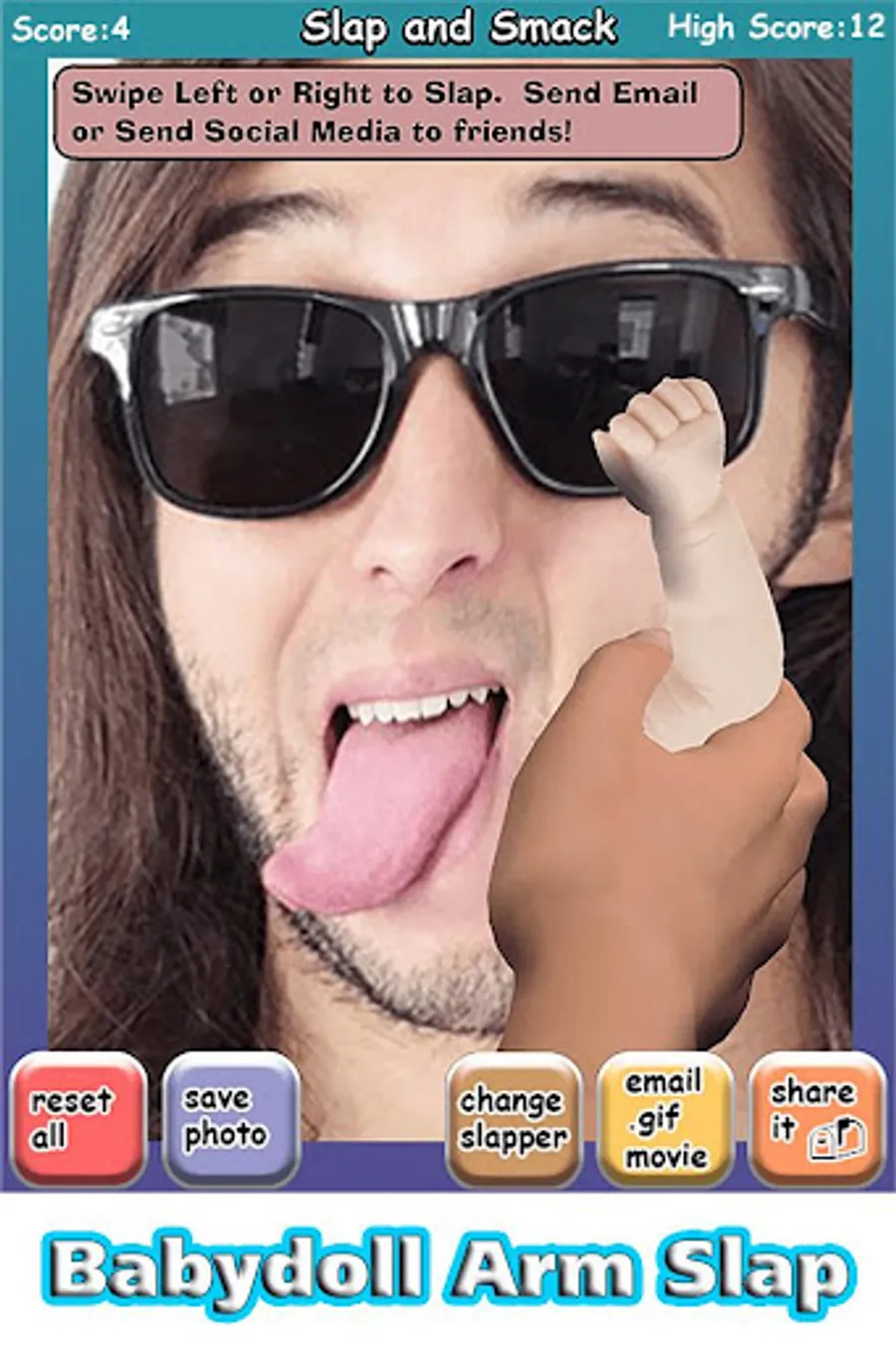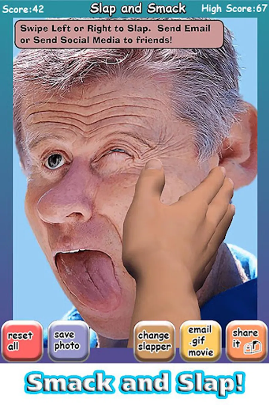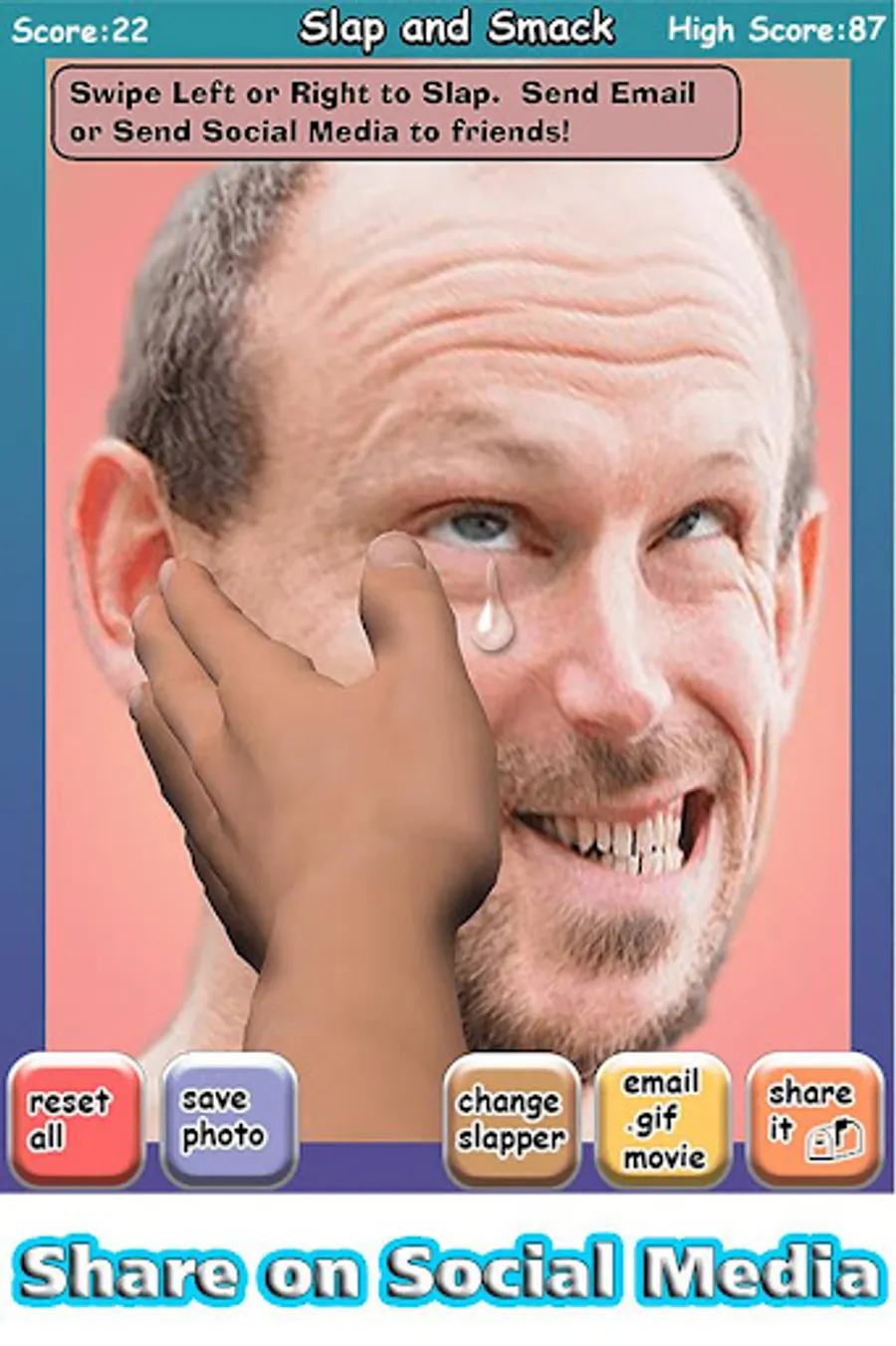 * Share the slapped pics and .gif movies via email and most social media