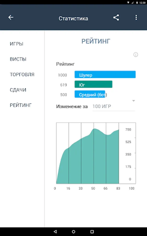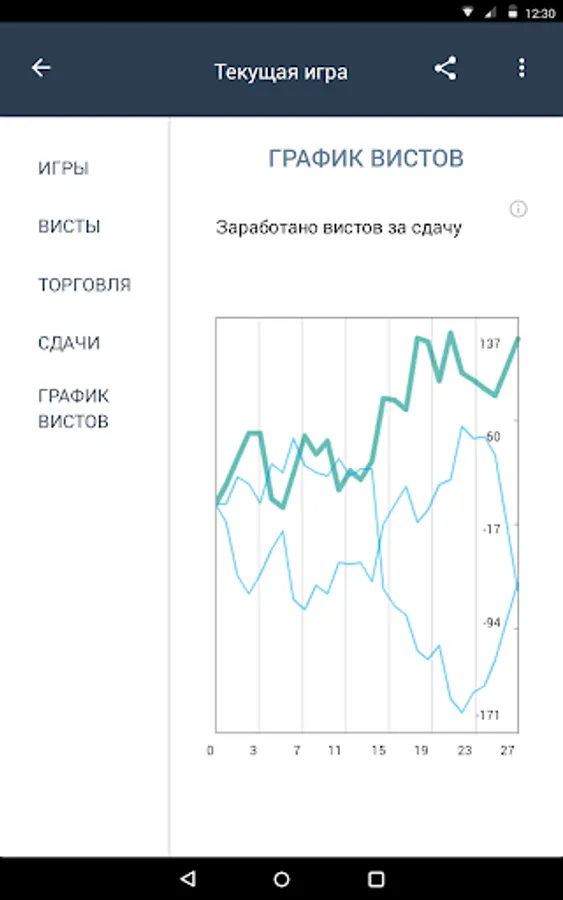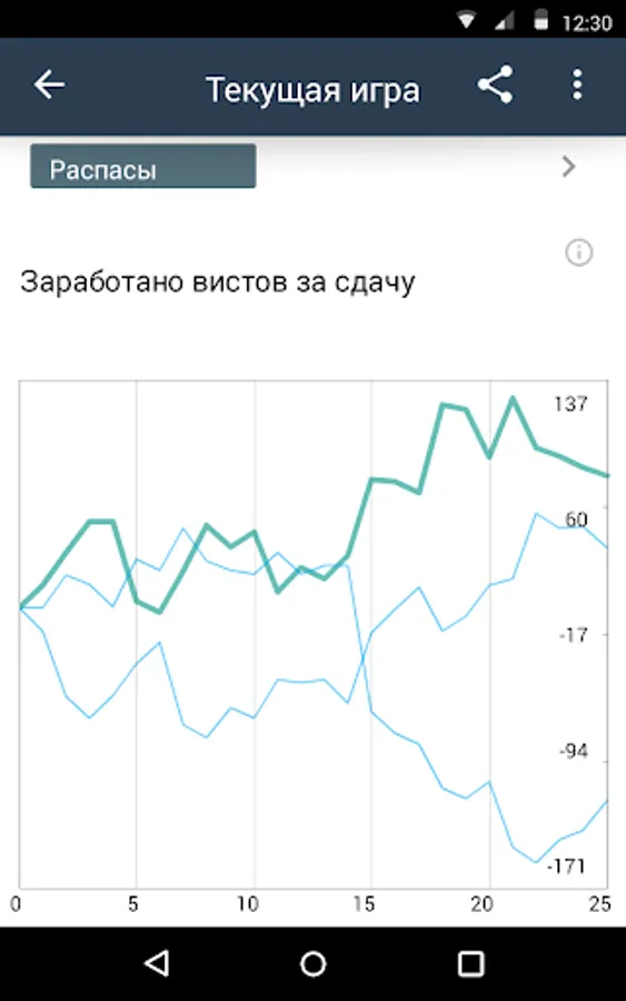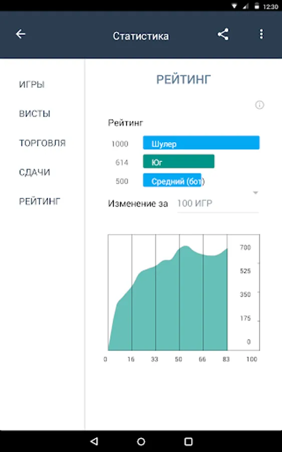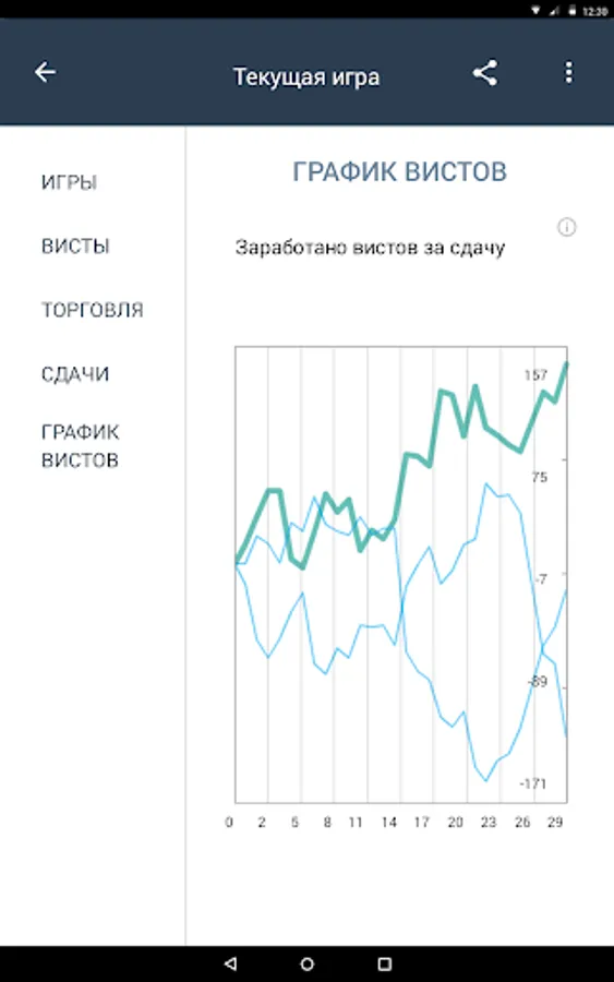 Stats data is collected for all games played and is used to build beautiful graphs and charts to help you evaluate your preferans skill growth.