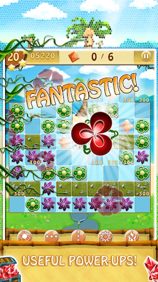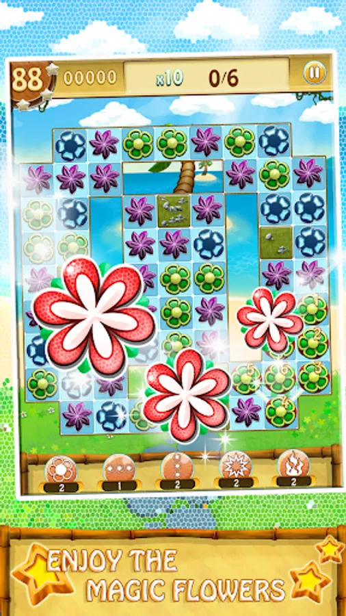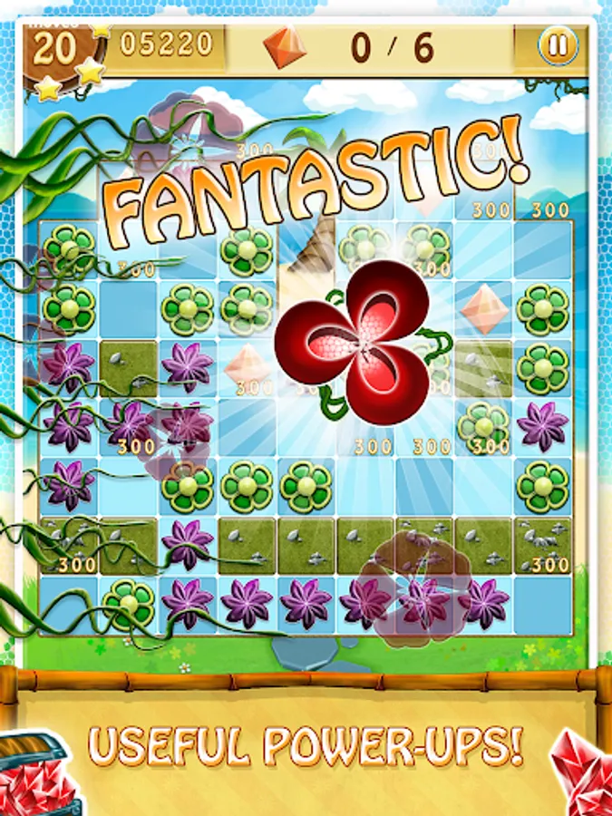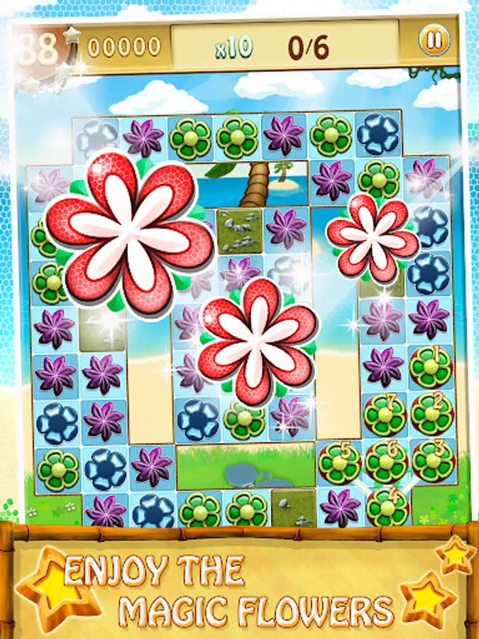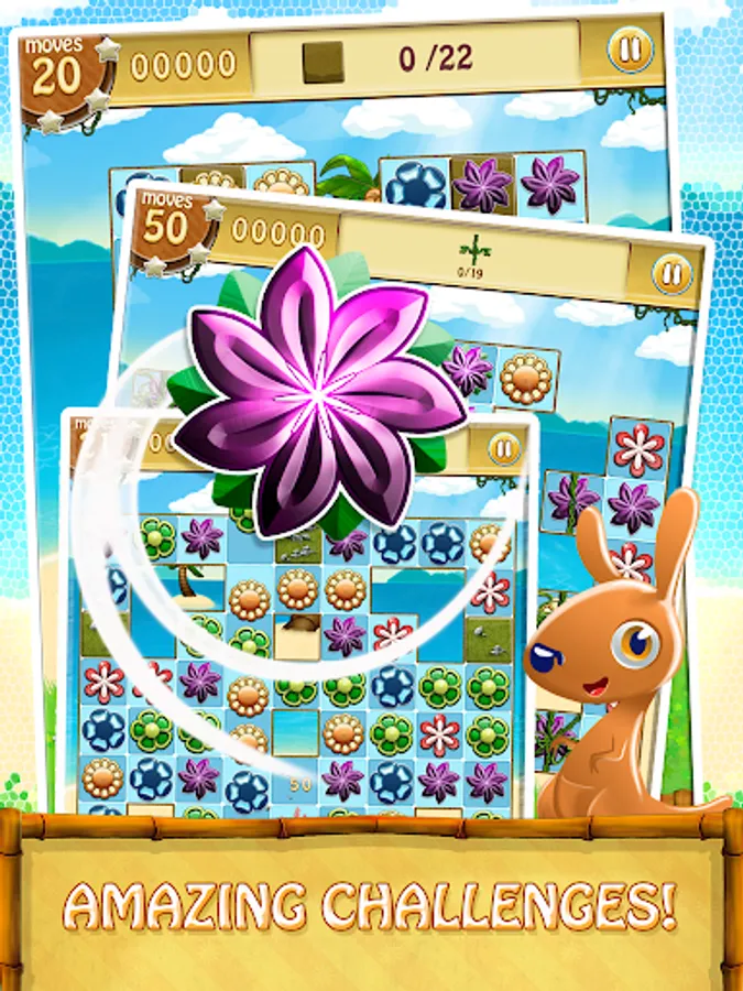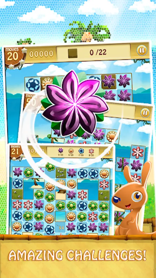 Help Kango the kangaroo collect magical flowers from the lost island! Link flower buds of the same colors to make beautiful flowers blossom and clear the flowerbeds before you run out of moves!