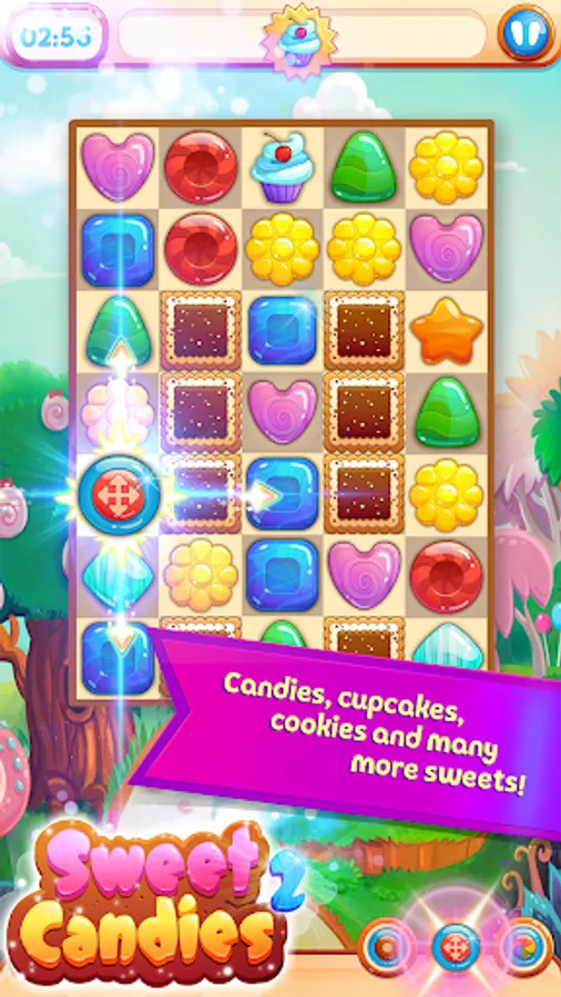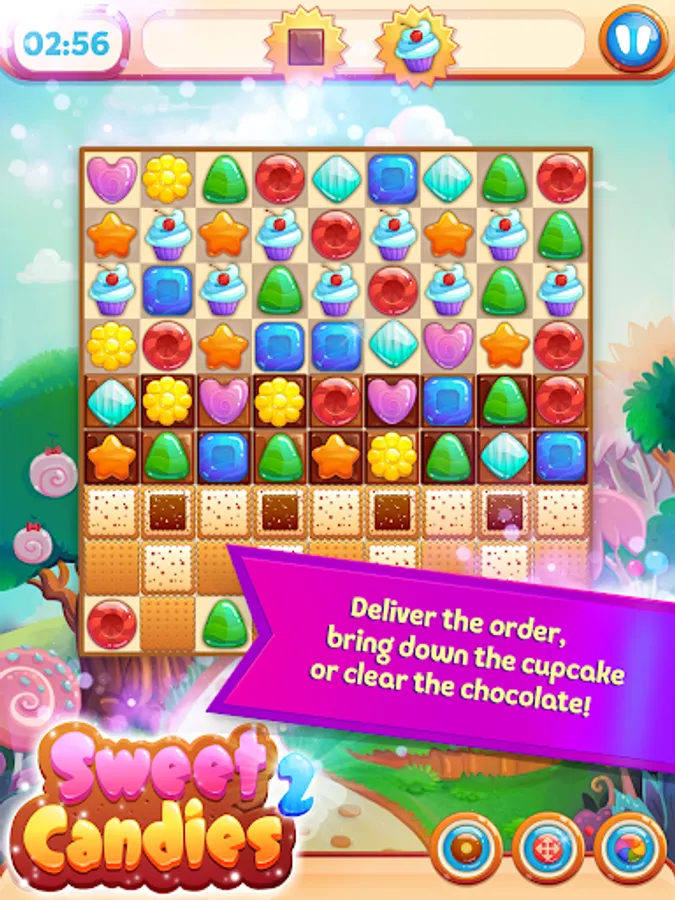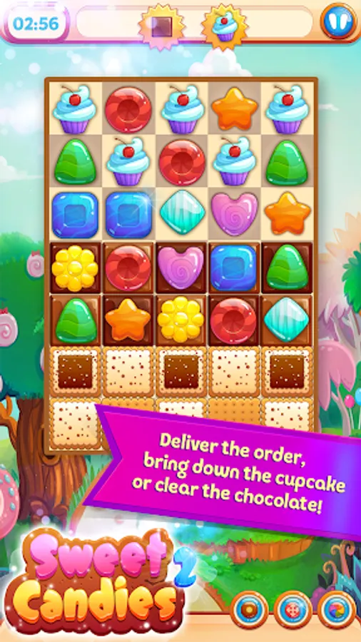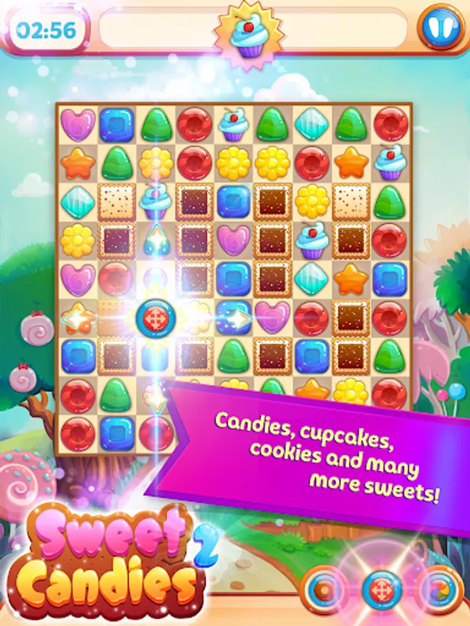 Discover the challenging bright and fun levels in this enjoyable game. Chocolates, cookies, cupcakes and colorful candies in abundance! Sweet? You bet ya!