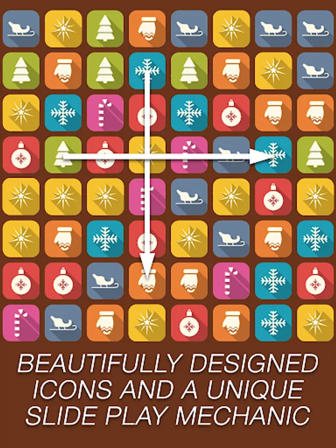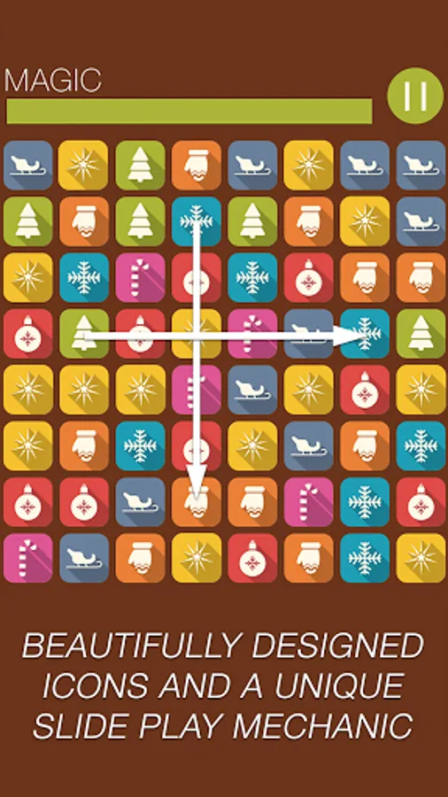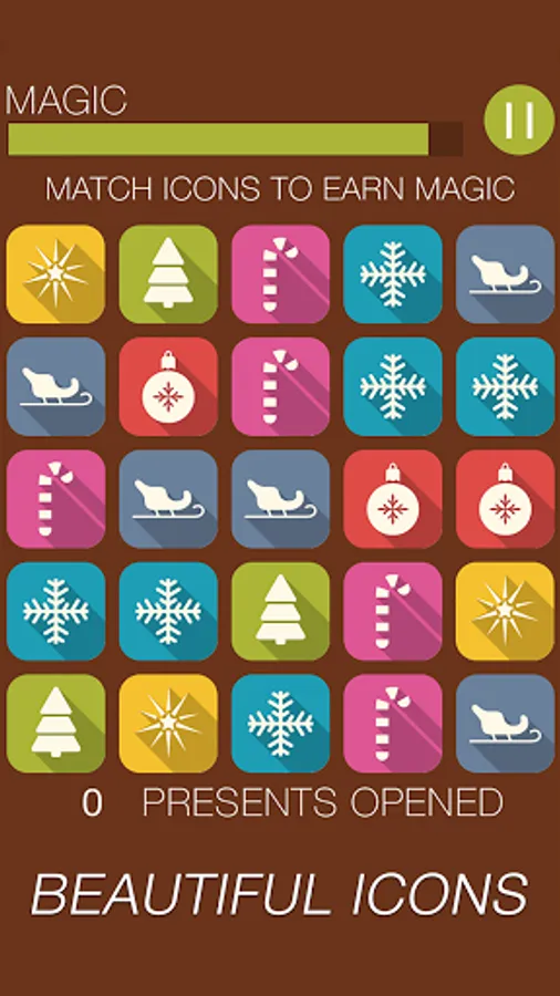 Holiday Magic is a unique match-5 christmas game! In this game, instead of swapping icon placement, you slide entire rows and columns to line up the icons where you want. A magic meter at the top counts down. Match 3 or 4 icons to fill it up with more magic. Match 5 to make gifts 🎁 appear! Match the gift to score points! Only matched presents count for your score, so what do you do, match 3 and 4 to keep the magic meter full? Or risk it and go for 5 to get a gift? There-in lies the challenge!