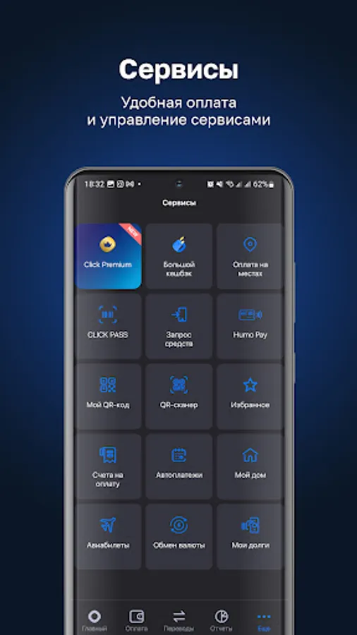 Click Premium subscription allows you to get double cashback for payments, return 100% transfer fees, make transfers through Click Boom, communicate with premium support and change the golden theme of the home screen for a fixed cost per month.