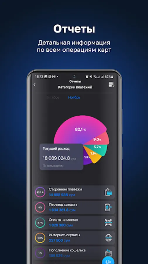 History of all payments (receipt, payment at retail outlets, cash withdrawals, etc.) for your UzCard and Humo cards