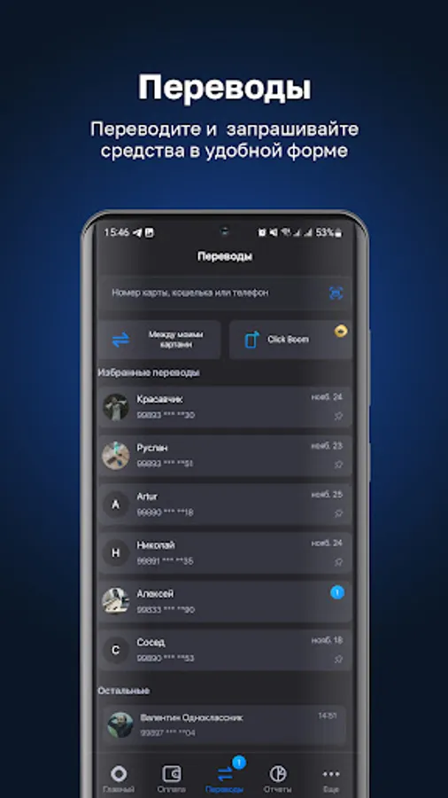 Transfer money from one plastic card to another. A transfer is available, as well as a request for funds to a CLICK user by phone number, by card number, as well as a transfer between their cards.