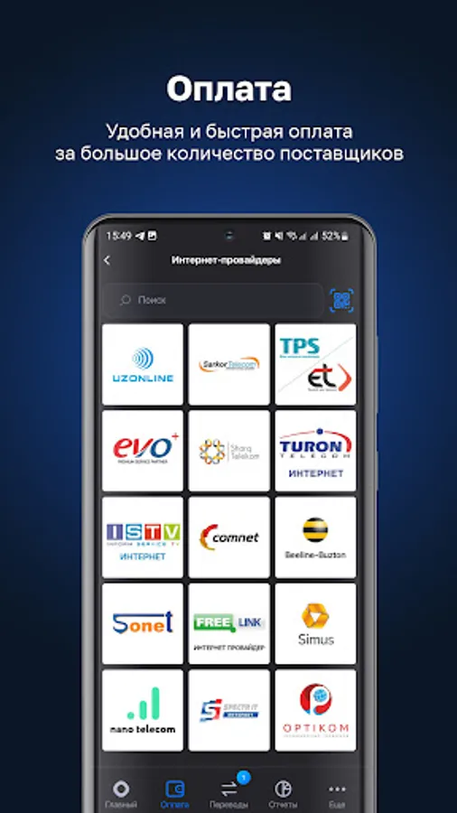 Mobile communications, Internet, landline telephone and telephony services, digital television, taxes and utility bills, transport services, ordering and delivering food, services and goods in online stores in Uzbekistan and much more;