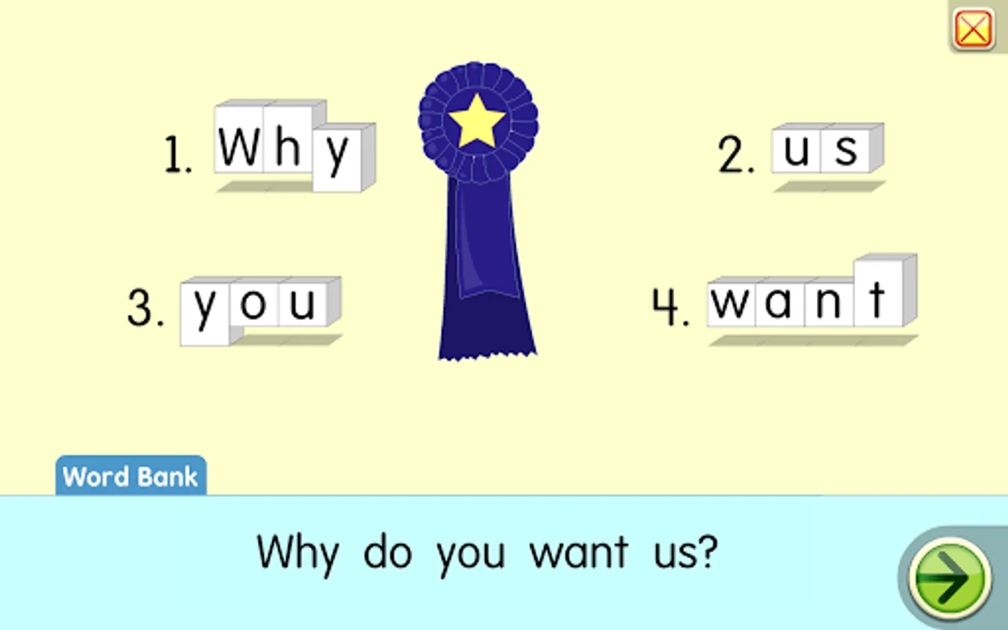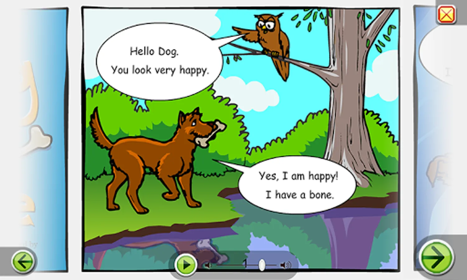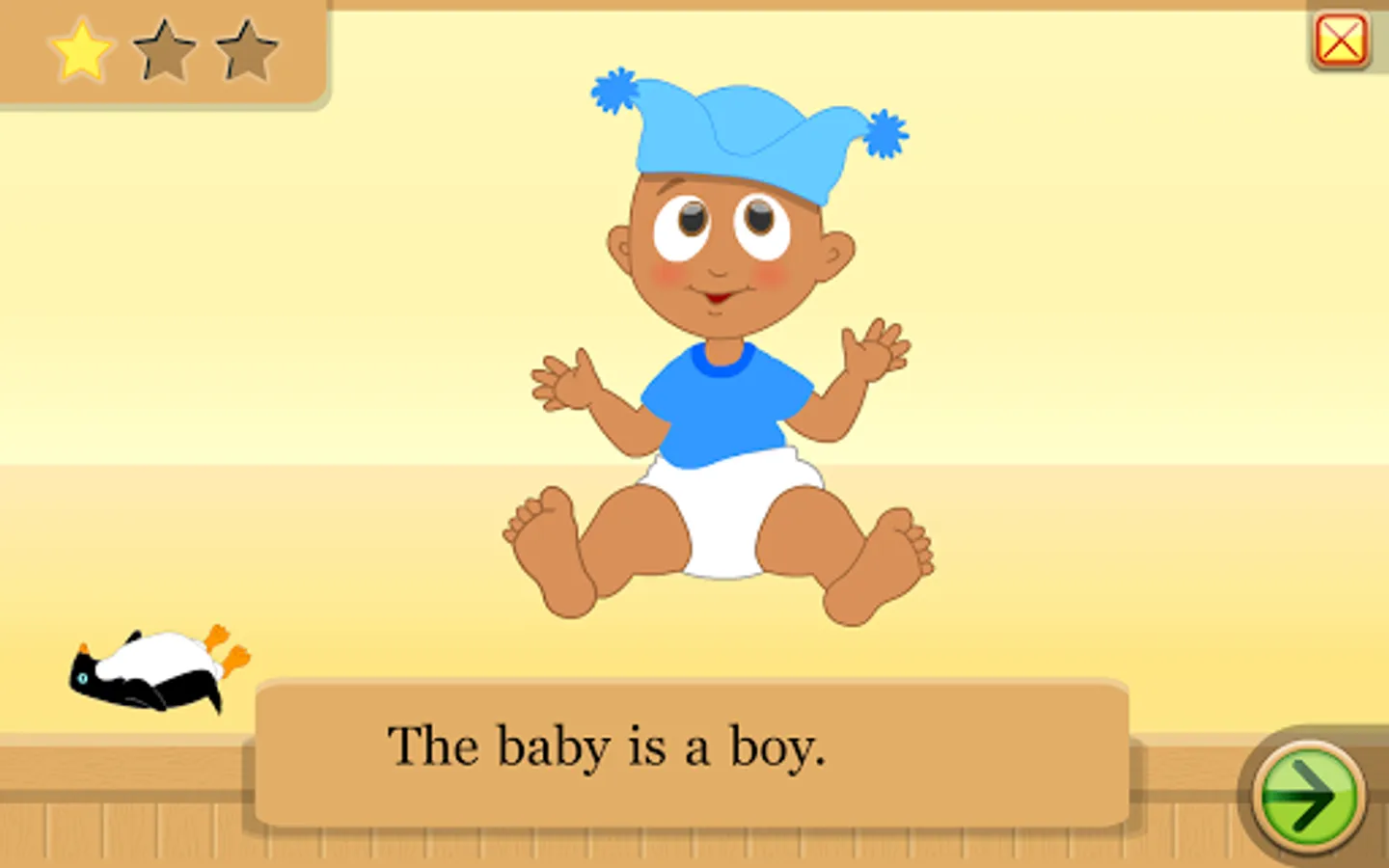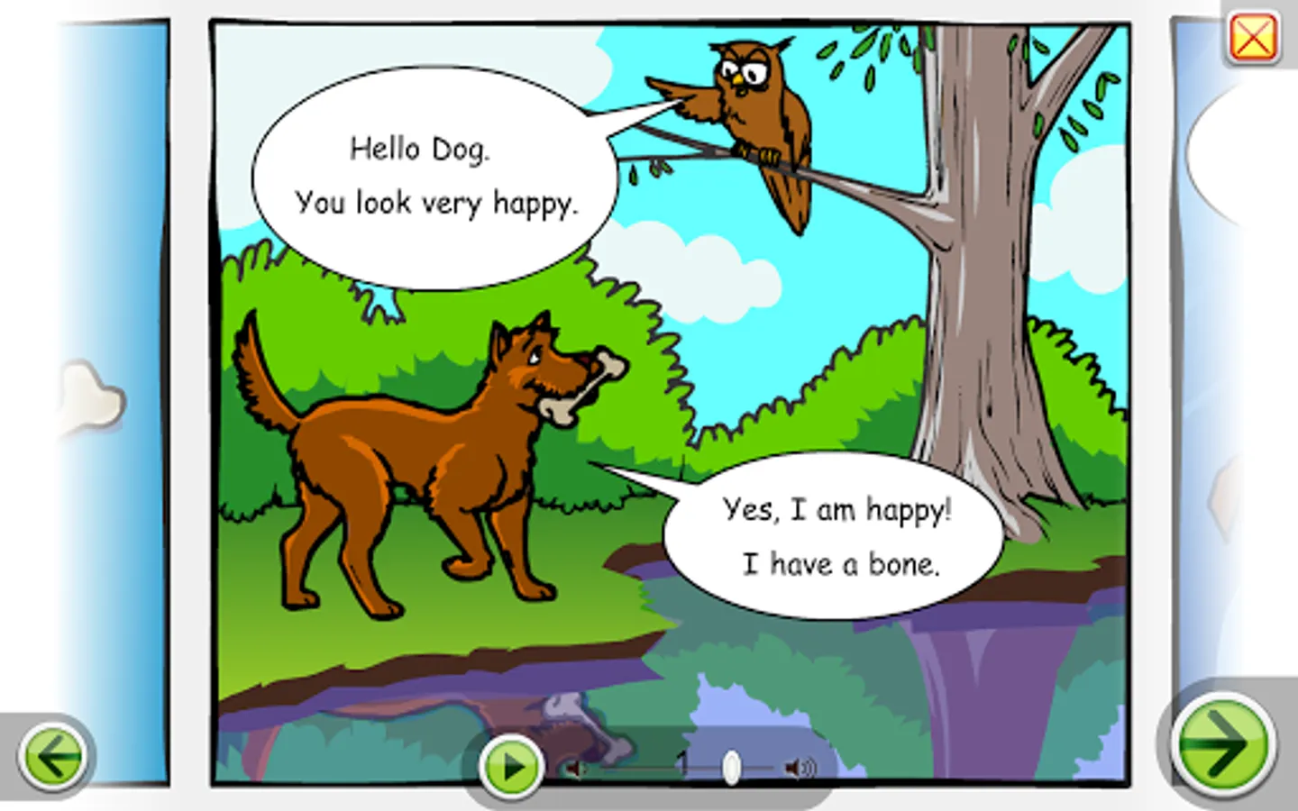 The stories in this app contain a controlled vocabulary set, using the words most frequently encountered in print. The stories and activities reinforce high-frequency words, also called “sight words,” in sentences rather than in isolation. This ensures the young reader will make a meaningful association with each word and more readily commit it to memory. The stories can be read aloud to model the qualities of fluent reading: intonation, expression, inflection and rate. Users can enable or disable the AutoRead feature. Speaker buttons are supplied for fluency when AutoRead is off.