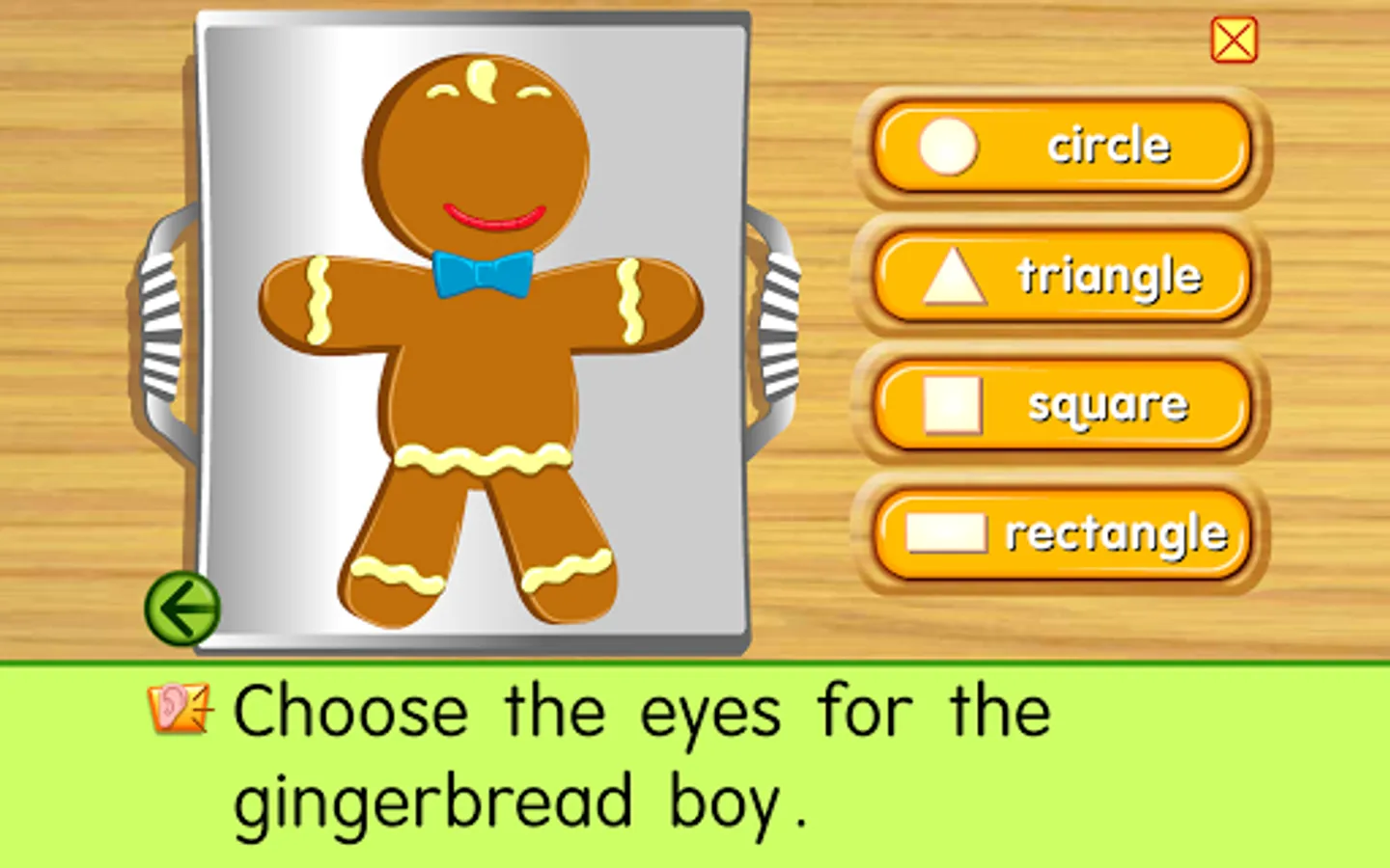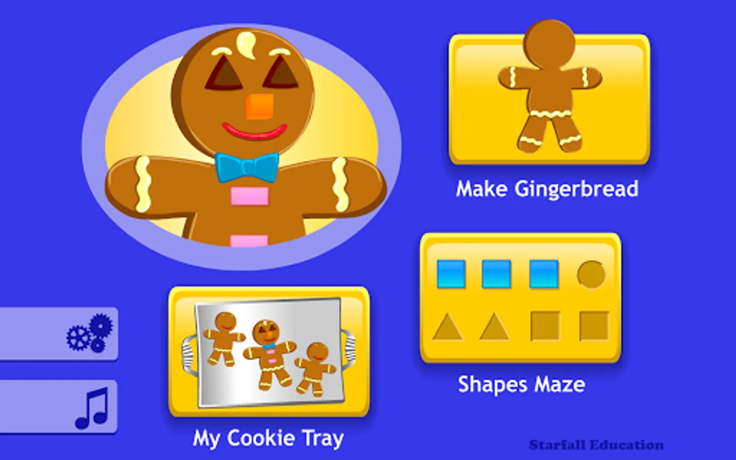 The Starfall Gingerbread app is a delicious way to learn 2D and 3D shapes. Children choose a girl or boy cookie, then decorate it with shapes and colors. In this App edition, create a tray of gingerbread cookies, then choose a favorite cookie to run through a maze following shapes or shape patterns. For accessible content visit www.starfall.com/h/accessibility.php