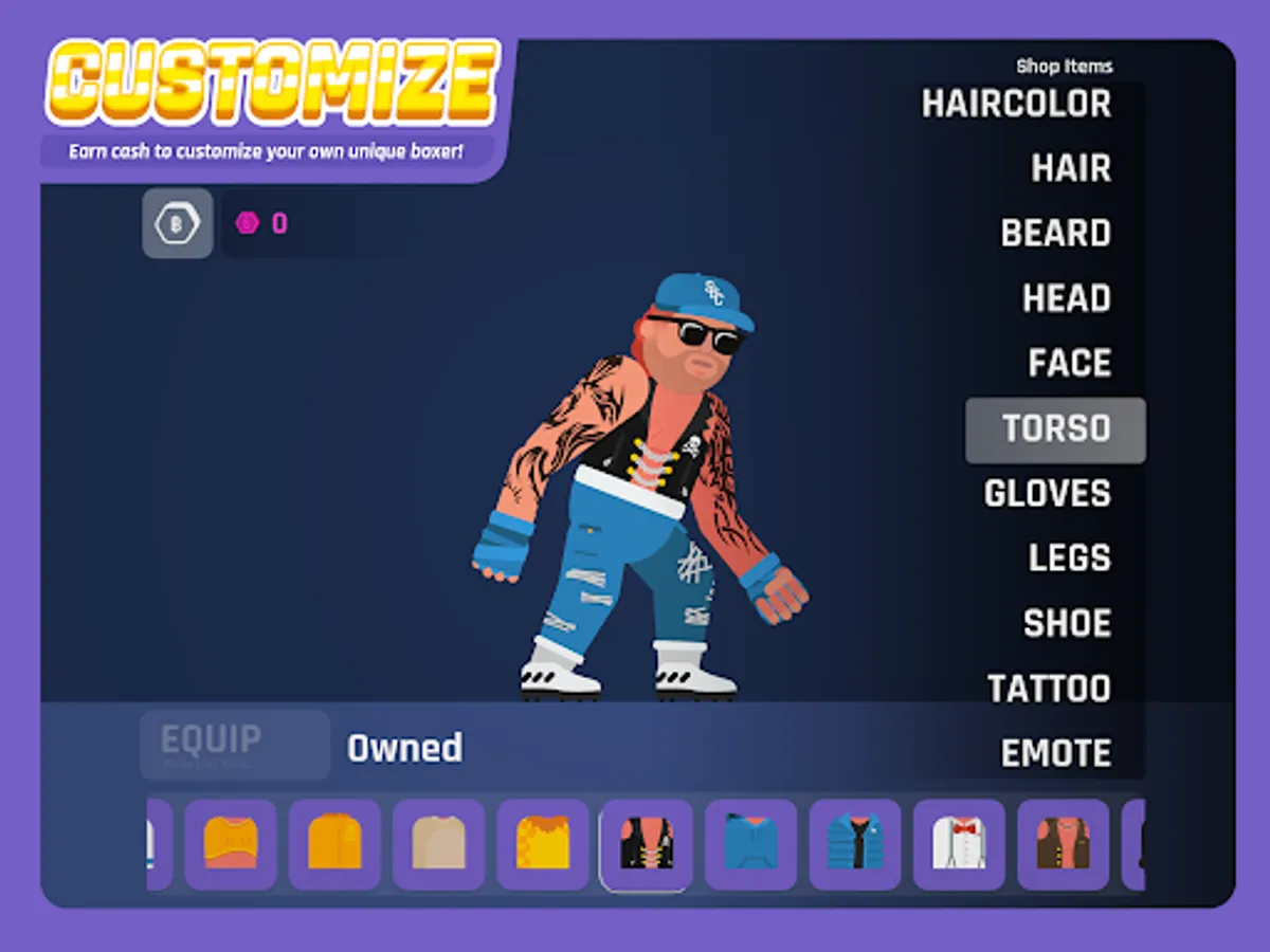 Earn cash to customize your boxer with an enormous amount of fun cosmetic items like hairstyles, beards, tattoos, headwear, facewear, shirts, shorts, gloves, shoes, hair colors, and emotes..