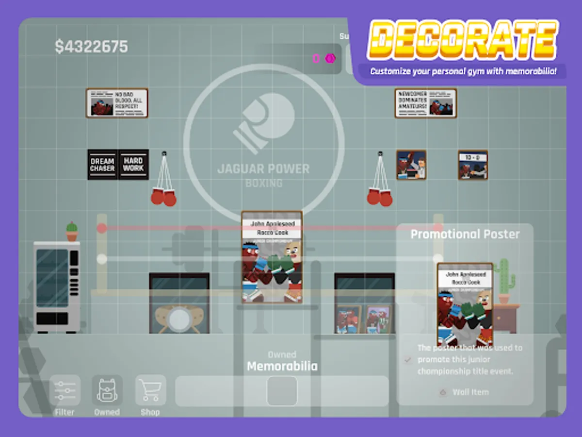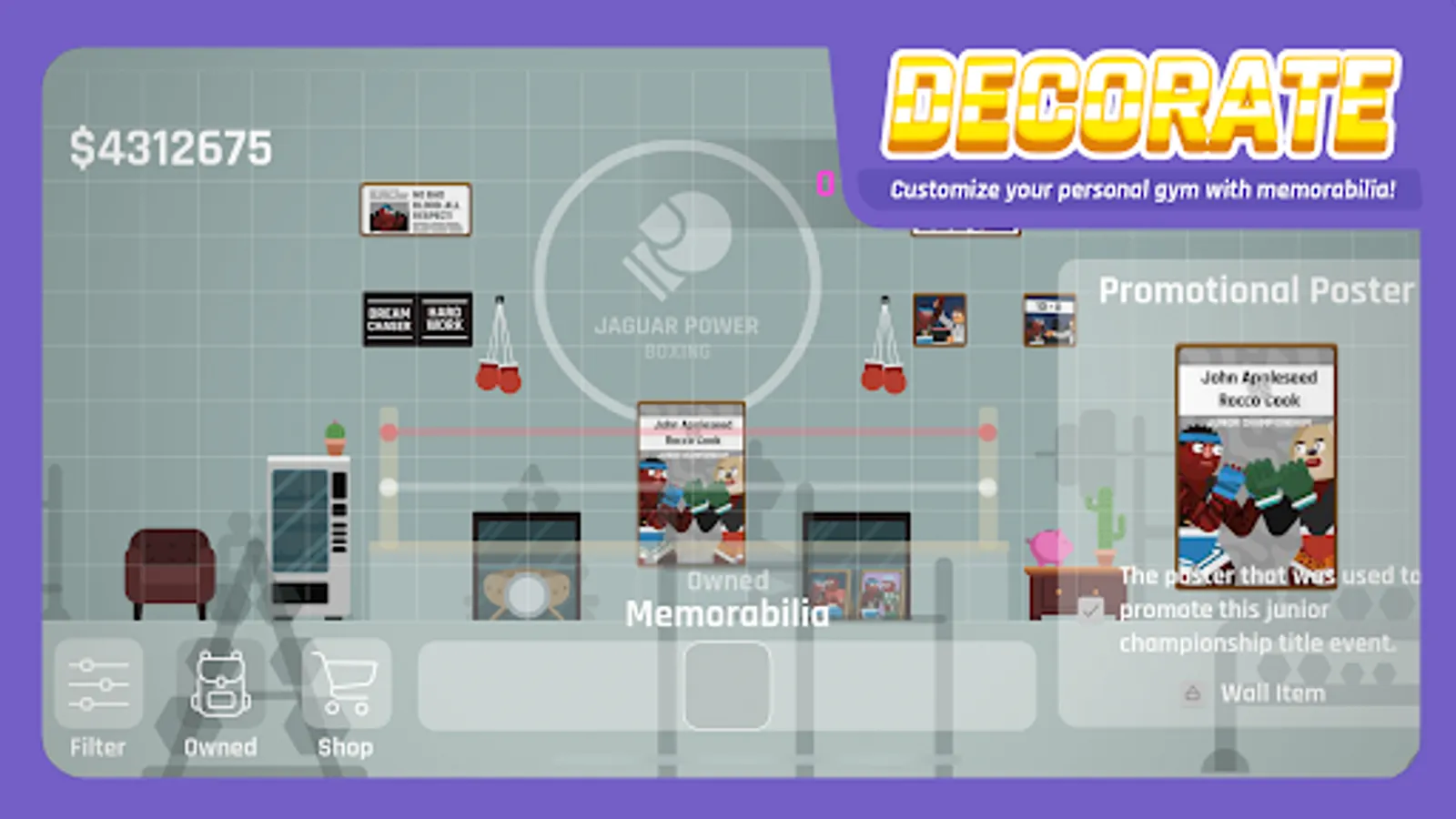 Create your very own unique gym that you can call home! Purchase furniture, decor, music, and colors. Earn memorabilia during your career to display in your personal gym to represent your journey throughout your epic career.