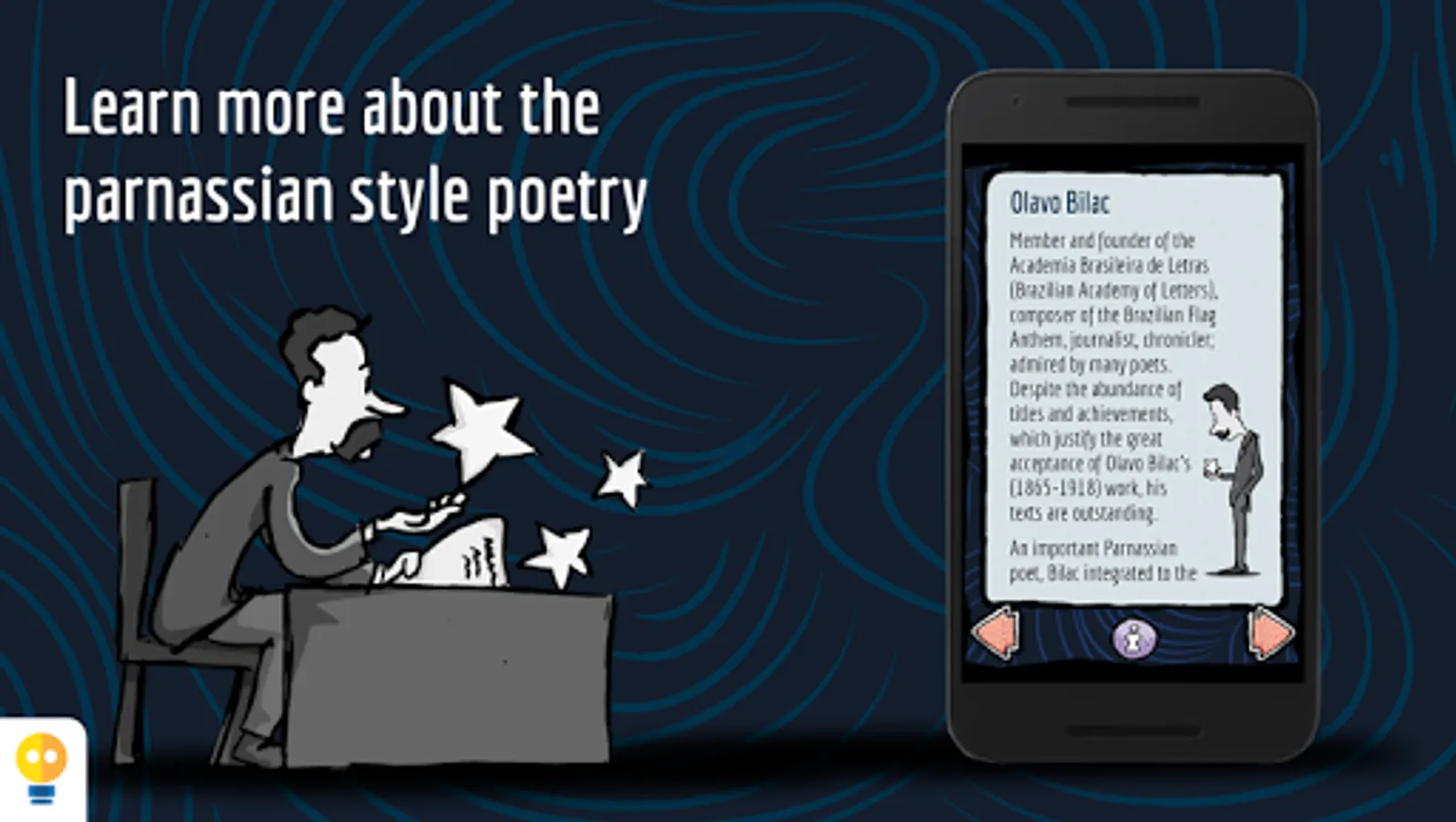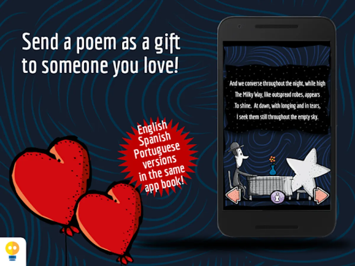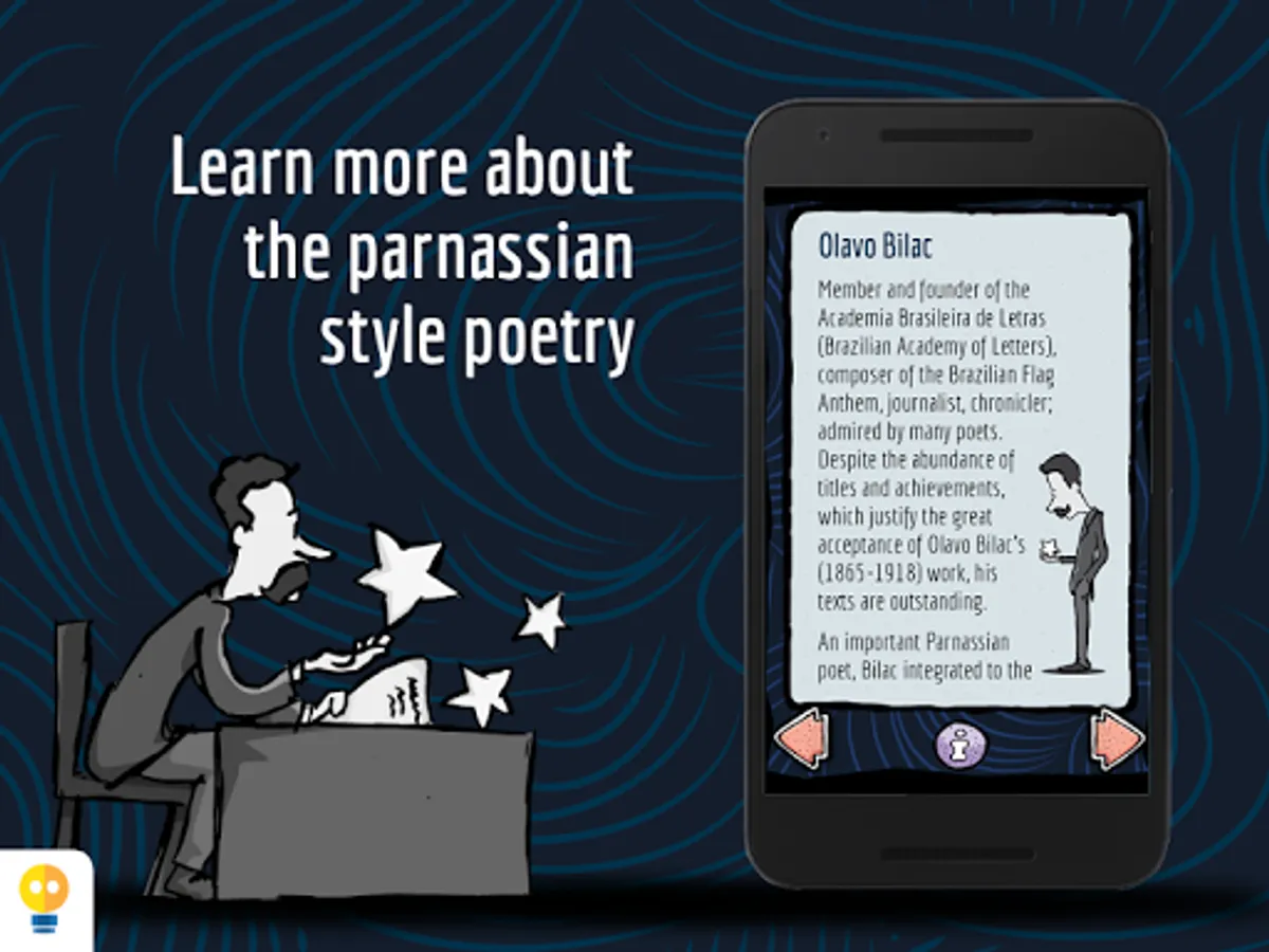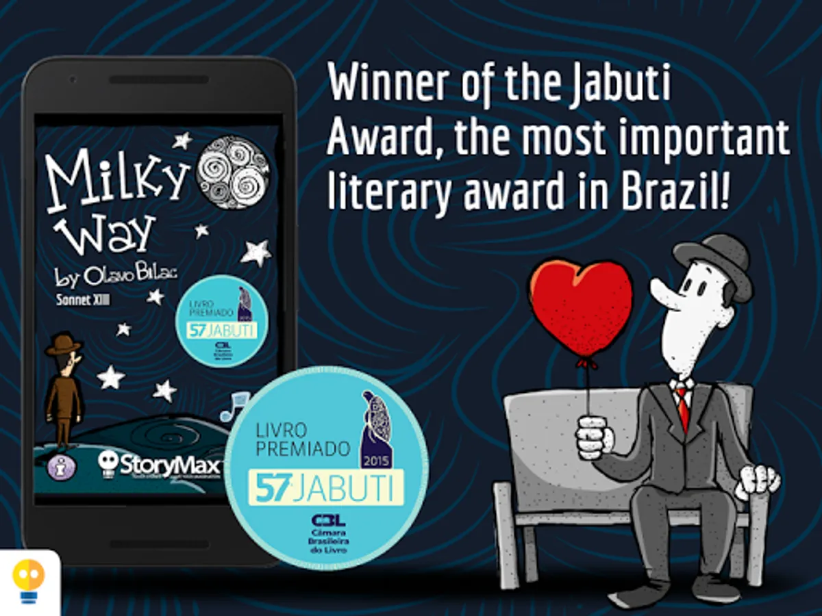 In Milky Way, the reader can reaffirm or discover the taste for the poem as a literary genre, by involving itself with the words, sounds and subtle poetic interactivities, like opening windows moving the stars with your breath, touch and hear the stars, and float alongside them in a bright night. The extras talk about the life of Olavo Bilac and present a summary on the parnassianism.