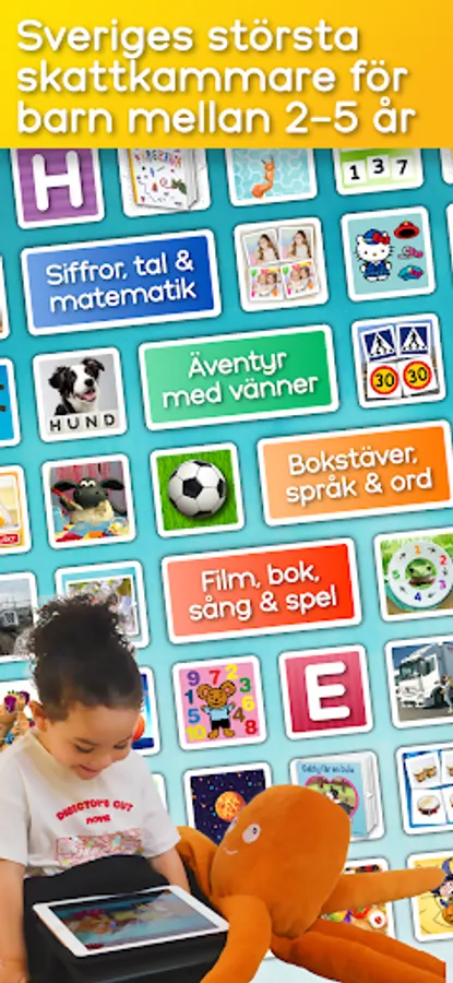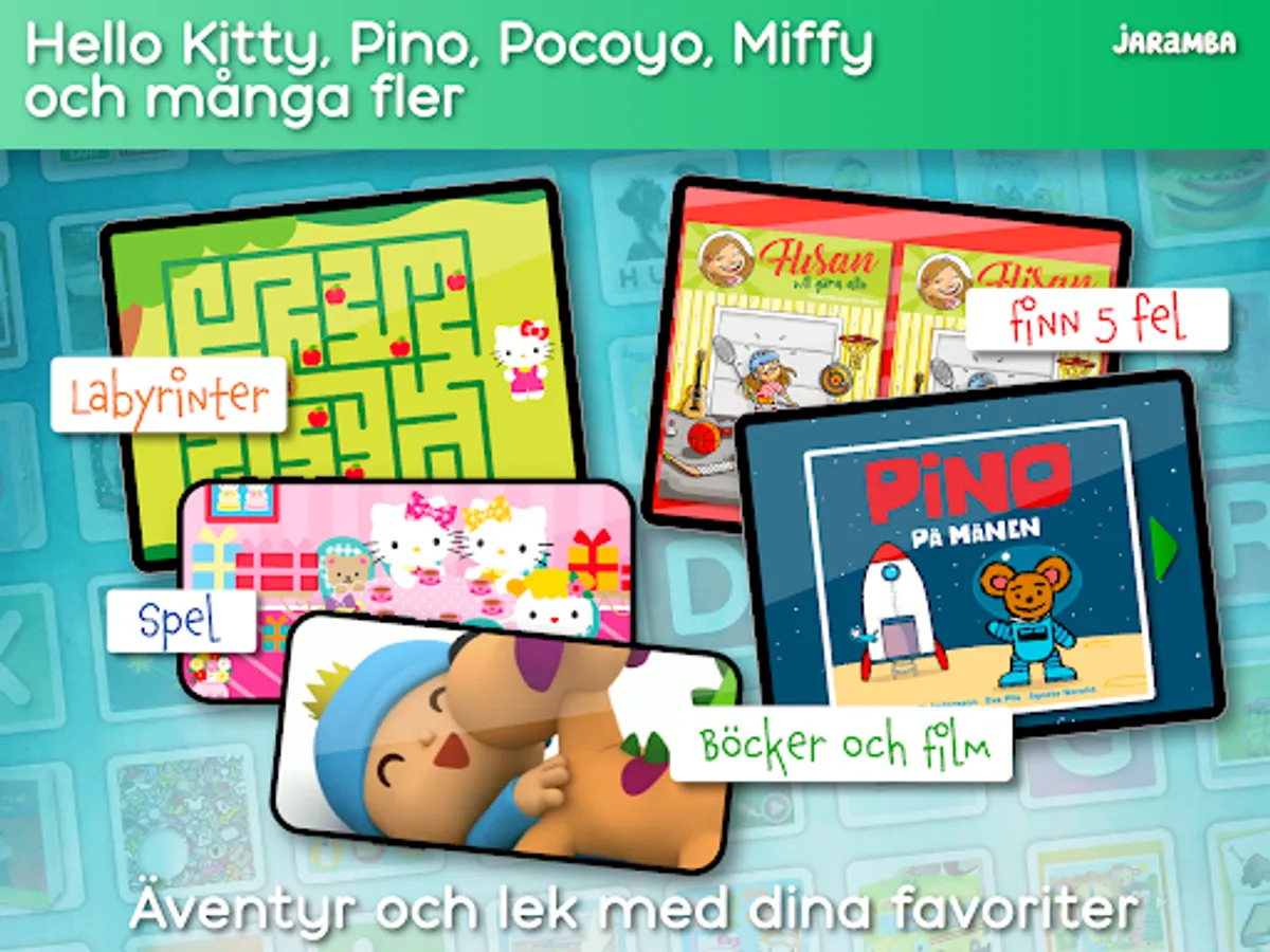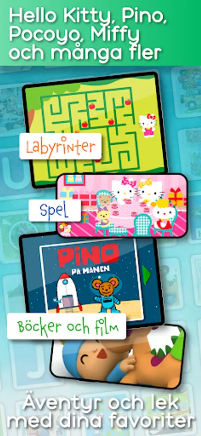 - Unique content as well as adventures with children's favorites such as Hello Kitty, Pino, Peppy Pals, Miffy, Timmy Lamm, Pocoyo, Babyloonz, Josie & Nani, Friends, Svea, Totta's things, Variegated, Flisan, Paddington and many more.