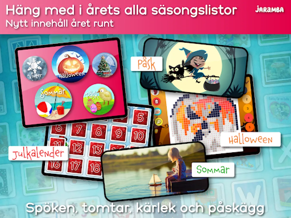 Jaramba offers loads of content that is constantly updated. There is always something new and exciting happening. Ghost with Jaramba on Halloween, look for eggs during Easter and open doors in the Christmas calendar. Join us for summer, autumn, Christmas, sports and Easter holidays. Or why not rub the genitals for school start?