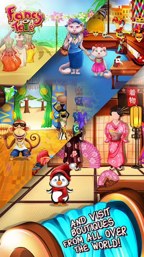 Match and stitch irresistible fancy dresses, suits, bags, jewels and make colorful new outfits for the friendly clients of Fancy Tale: Catherine the Cat, Pip the Penguin and many more!