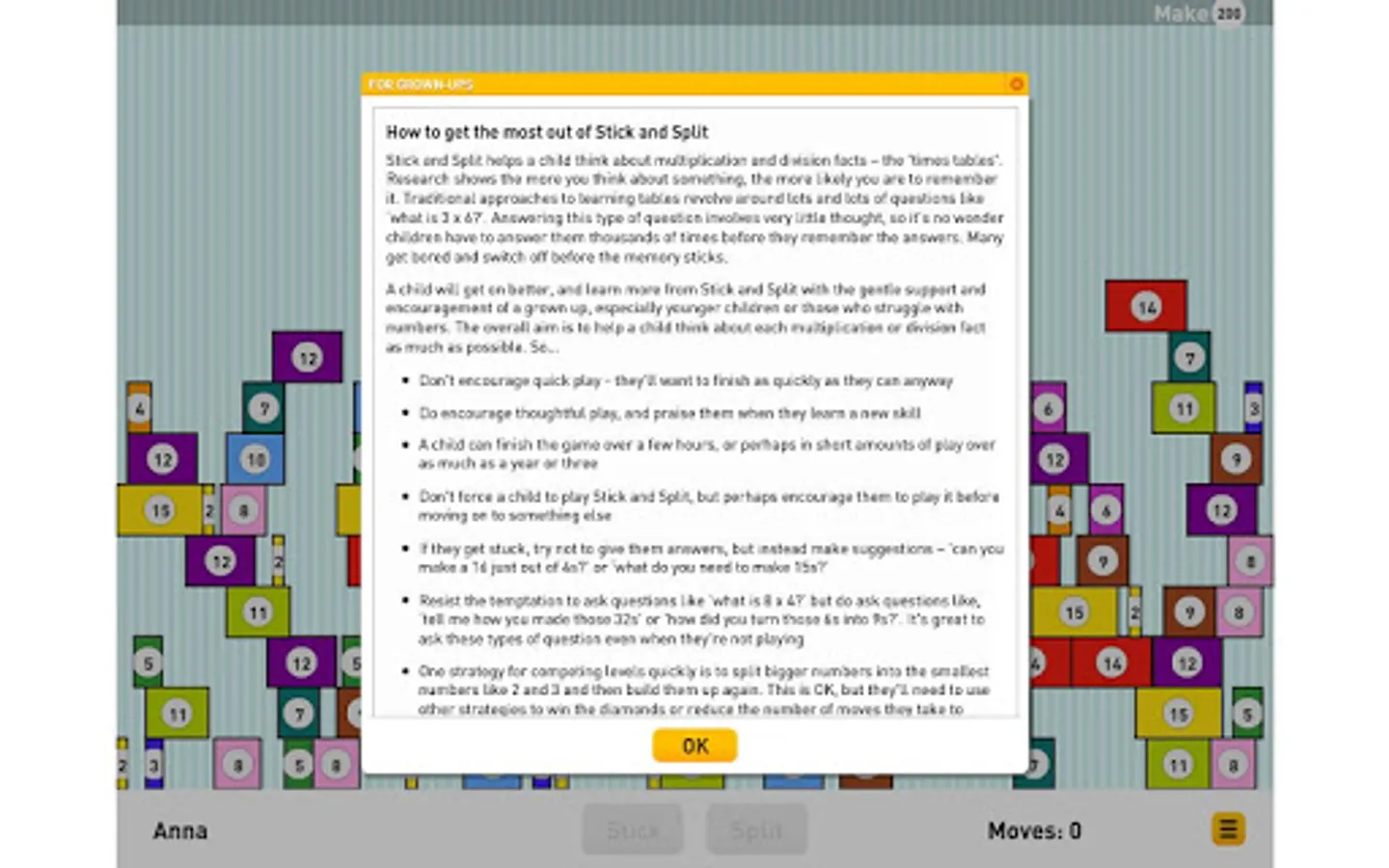 Stick and Split has been carefully designed to encourage children to think much more about multiplication and division facts. There are no right or wrong answers, so it won’t induce anxiety. Instead they need to be constantly thinking what they need to do. The more they think, the more they remember.