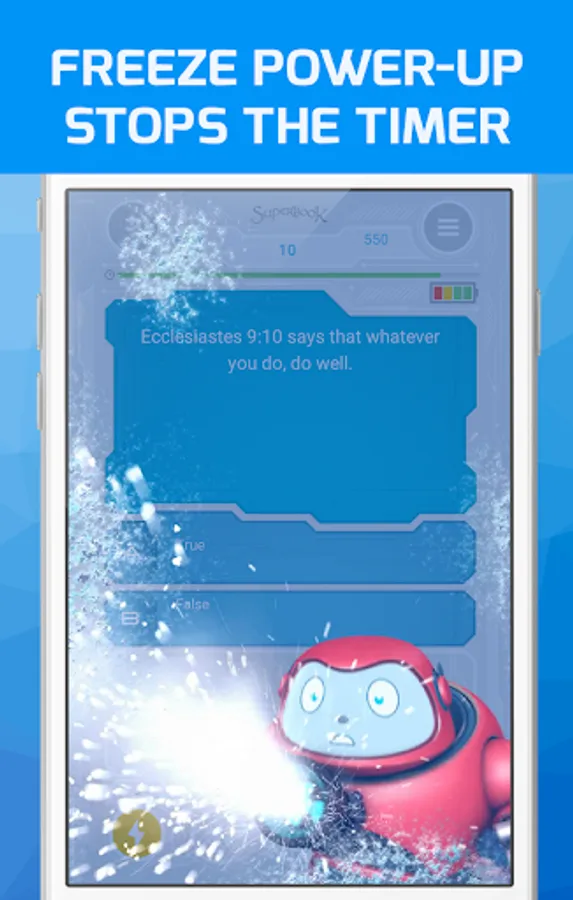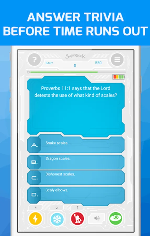 • UNLIMITED BIBLE HINTS – Shhhh! If you are playing against somebody and trying to beat their high score, you may want to keep this option a secret. If you choose the green Superbook Device button, you will get the Bible verse and it will almost always show you the correct Bible trivia answer.