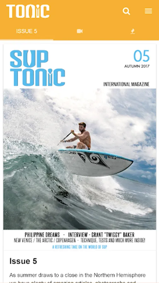 Tonic Mag is a free SUP magazine that focuses on all aspects of the sport, racing, wave riding, exploration, recreation and fitness. It is published every 2 months and is completely free to read. This app will give you instant access to the entire magazine and allow you to read and search reviews, technique articles and videos.