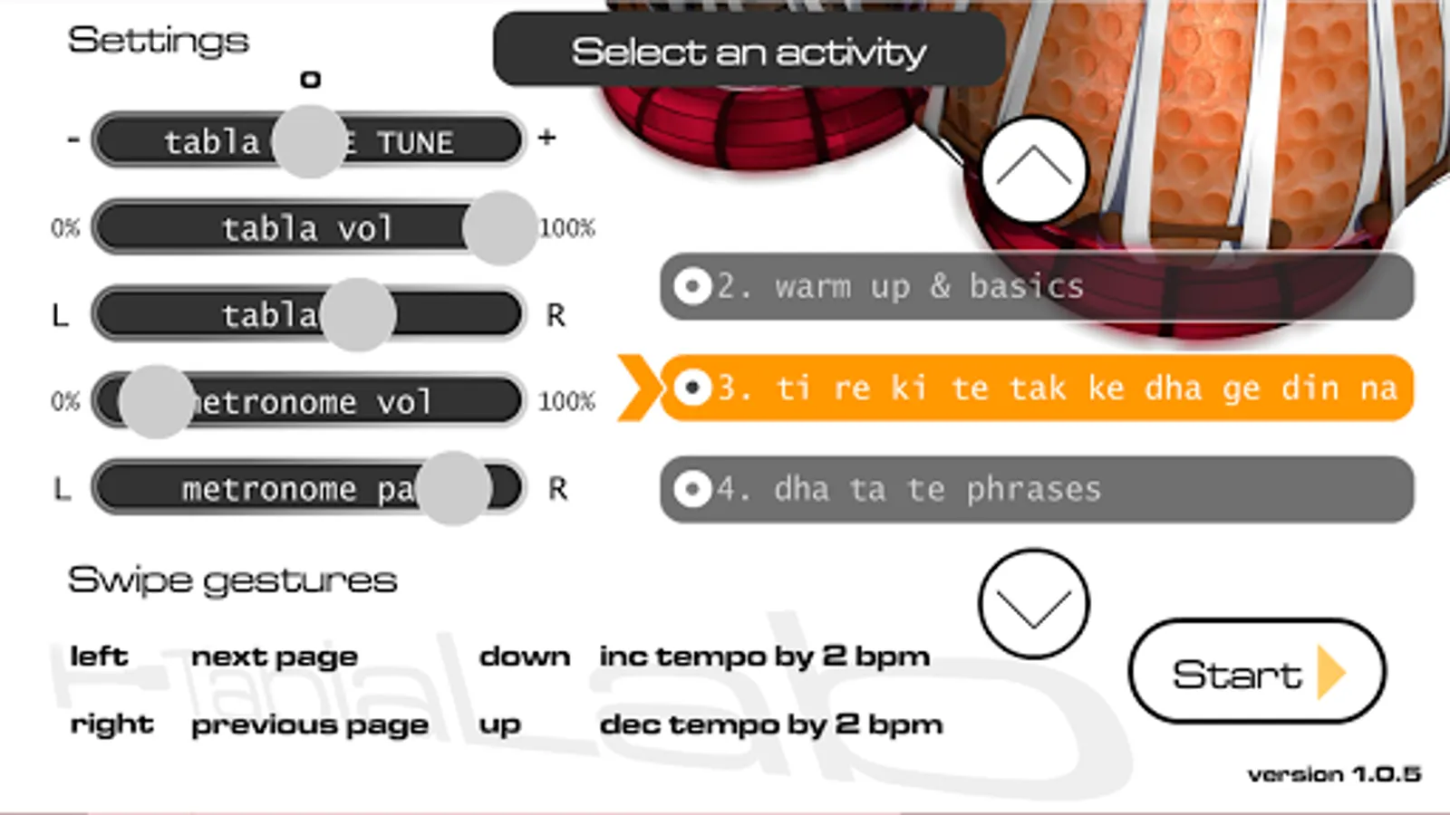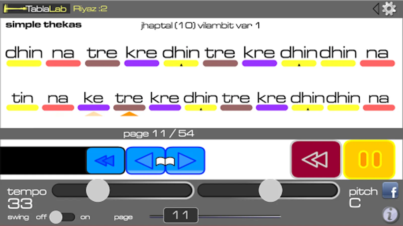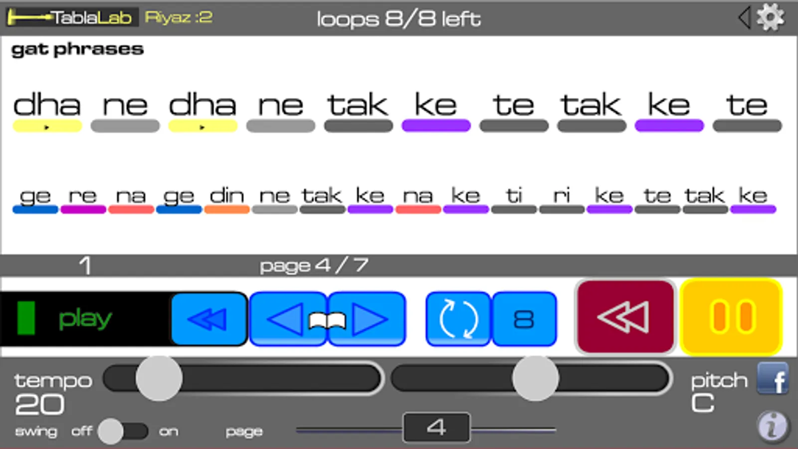Tablalab Riyaz will play a phrase to you and then leave a space of the same duration for you to play the phrase back. Your performance is not marked or scored – you can judge for yourself whether you are happy with your interpretation or not.