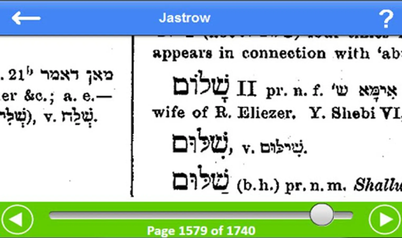 Fast search, multiple definition display. One click to show the actual page in the Jastrow that your word appears on for usage examples and further sources.