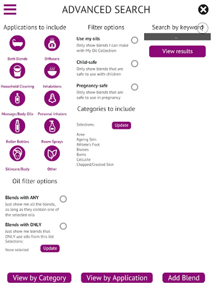 - Advanced search options allow you to easily find the recipe you need. Ever got a new essential oil and thought “What blends can I make with this…?”