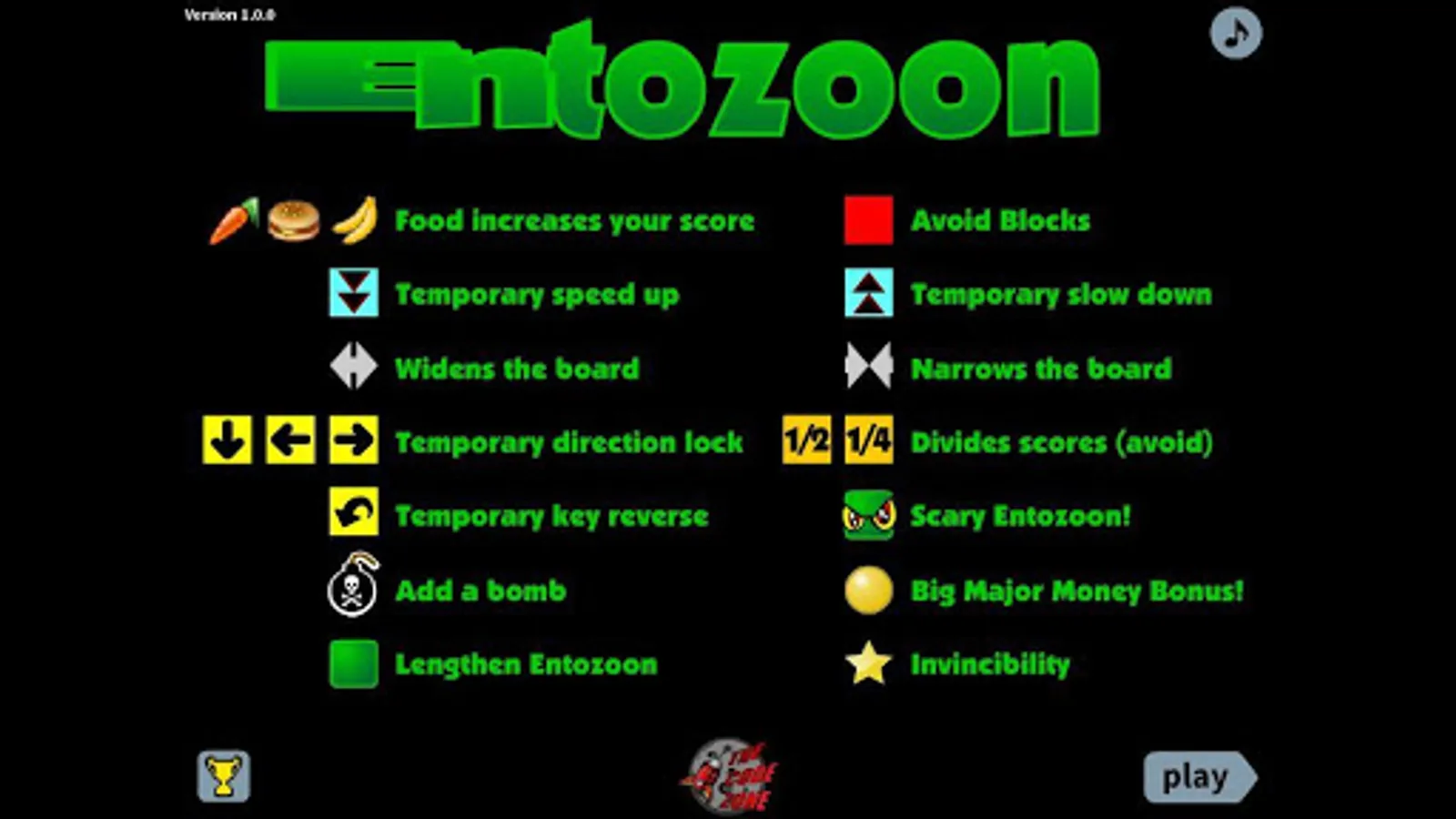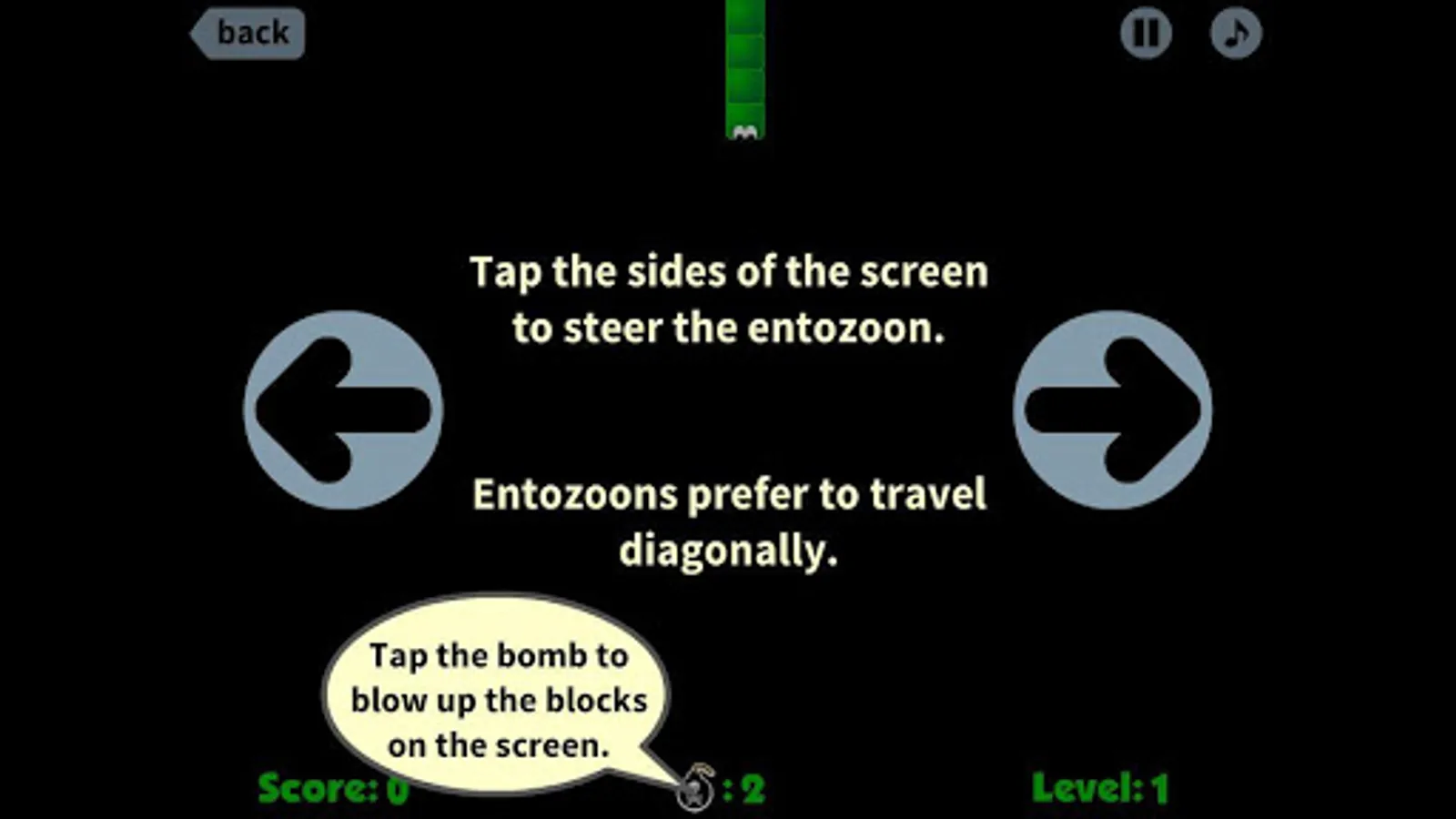 Ready to get your retro on? Well here you are. A classic infinite-scrolling worm tunneler. You are an entozoon (web-search for it) traveling down an ever-narrowing tunnel full of goodies to grab and things to block your way. There are plenty of pickups and powers along the way.
