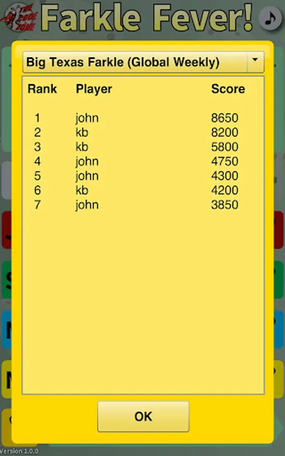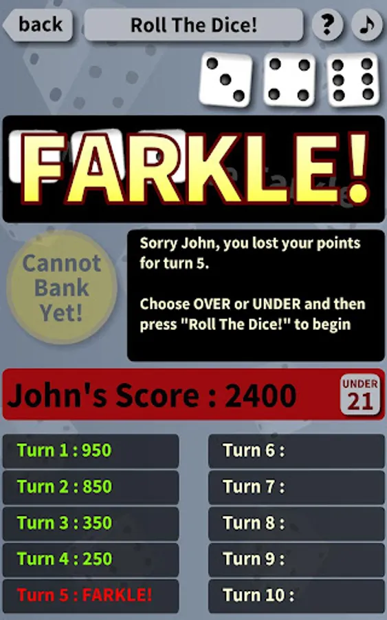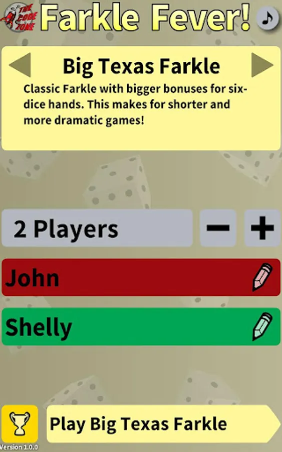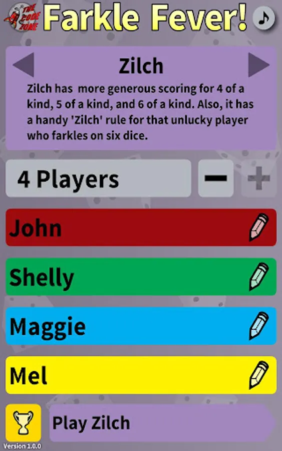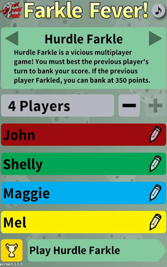 If you are a fan of dice games, this belongs on your list. Farkle Fever is a collection of six different great "press your luck" dice games that can be played solitaire or with up to four players. Included is the classic "Ten Thousand" version, as well as some high-bonus variations, a cutthroat version called "Hurdle Farkle", a "Farkle-less" variant called Zilch, and even one with a side-bet.