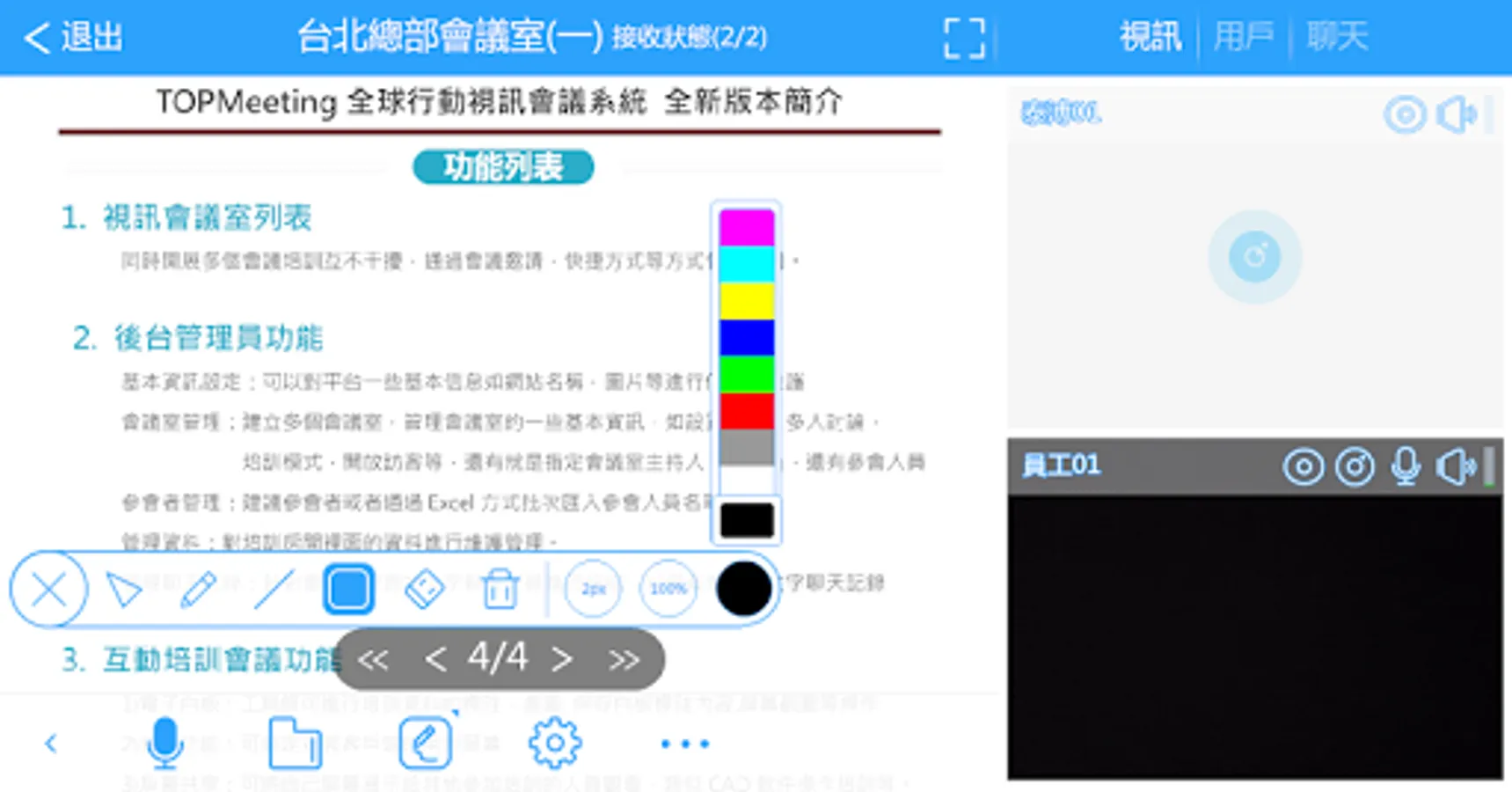 目前提供手機版功能:多方視訊語音交談、視訊培訓模式、視訊討論模式、視訊會場模式、電子白板互動、電子檔共享下載、與會者線上聊天區、線上點名及線上投票、會議室管理者設定功能、會議室錄影功能、訪客與會登入。