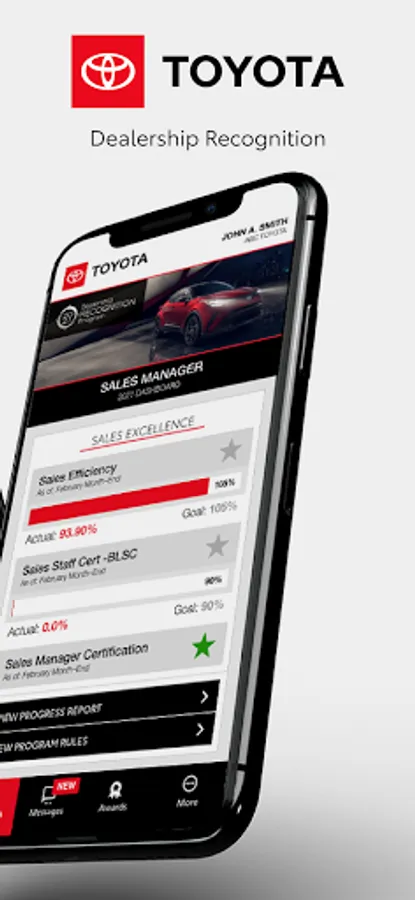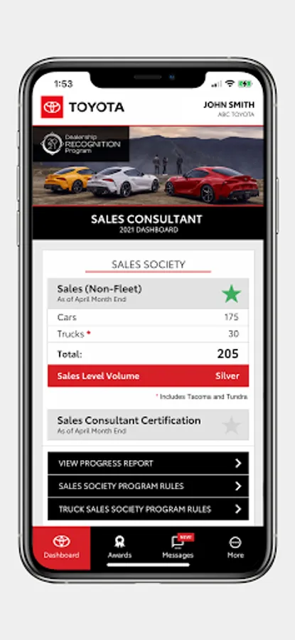 The Toyota Dealership Recognition App is a convenient mobile app for use by Sales Consultants and Sales Managers to view program-level performance dashboards and track status toward incentive rewards.