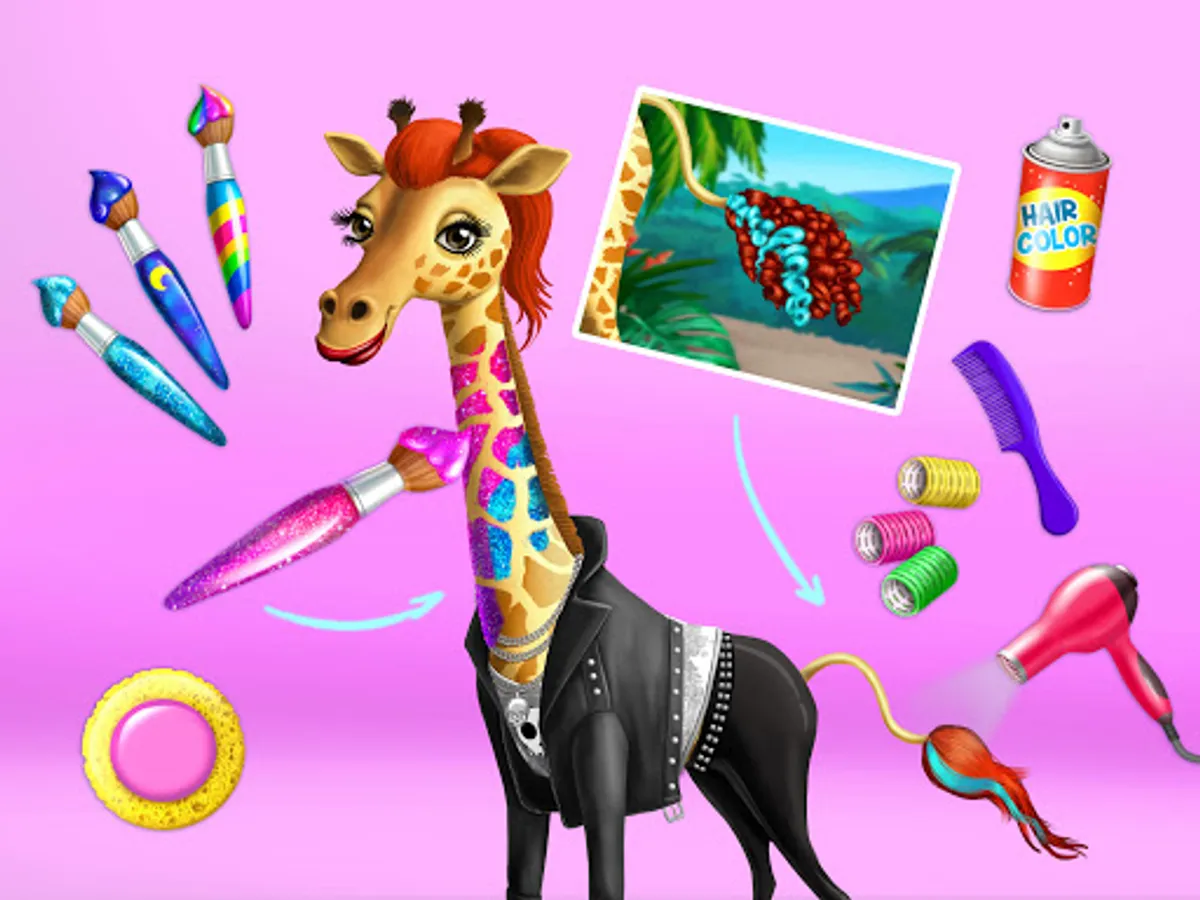 Fashionista giraffe Rachel wants her favorite animal spa treatments! Cut, dye and wash her hair. Create a cool style for her tail! Paint Rachel’s nails red and surprise her with super bright makeup. Mix and match edgy clothes and accessories and style a new bold look for Rachel!