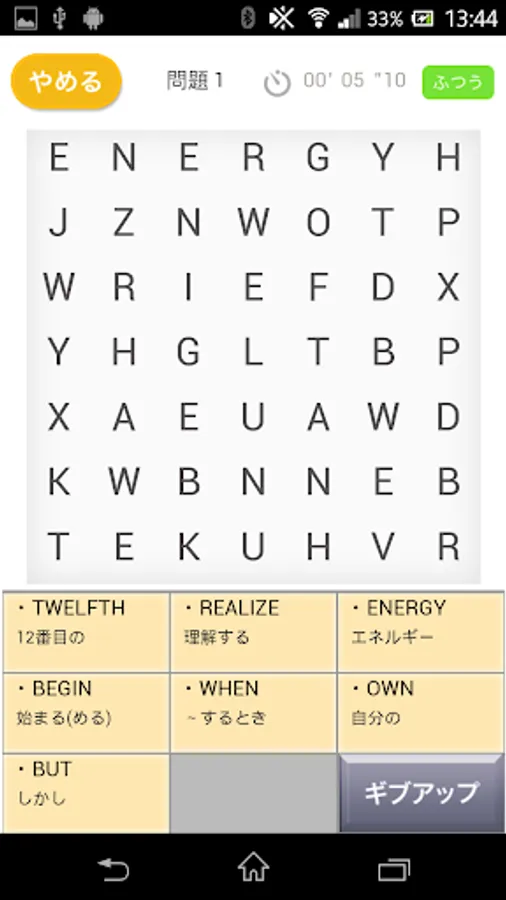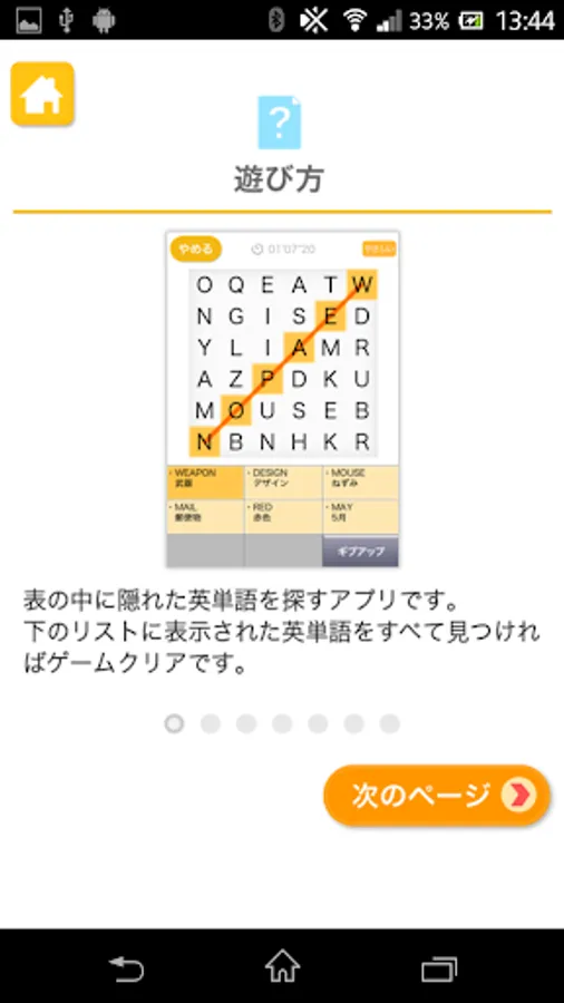 表の中に隠れた英単語を探すアプリです。リストに表示された英単語をすべて見つければゲームクリアです。