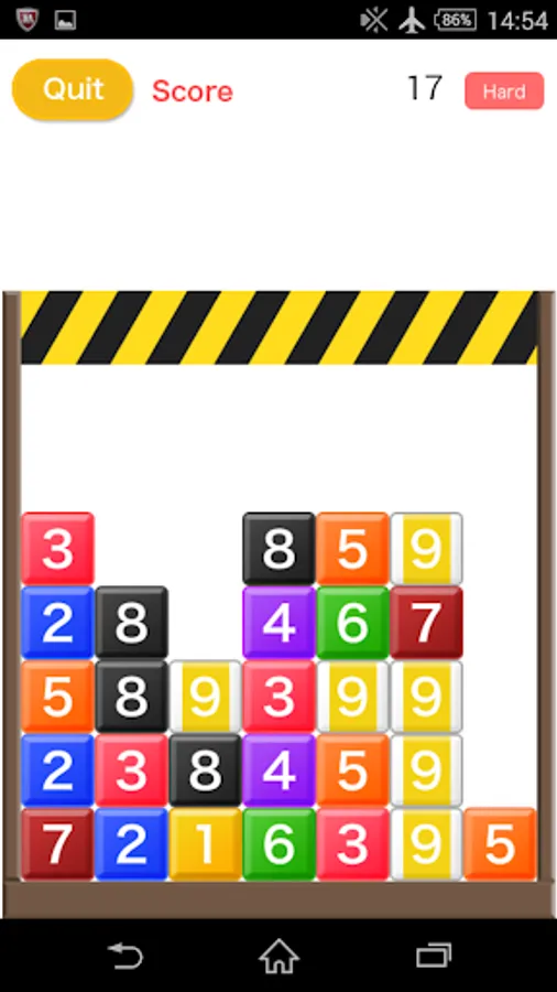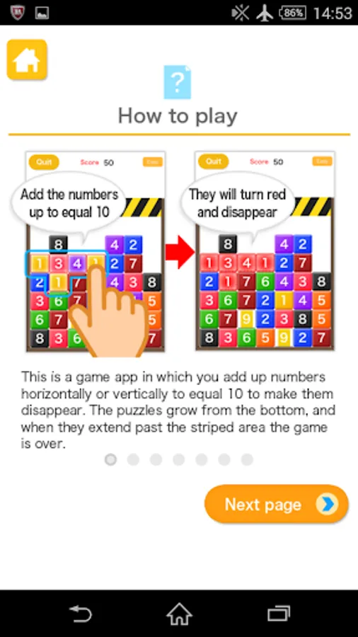 This is a game app in which you add up numbers horizontally or vertically to equal 10 to make them disappear. The puzzles grow from the bottom, and when they extend past the striped area the game is over.