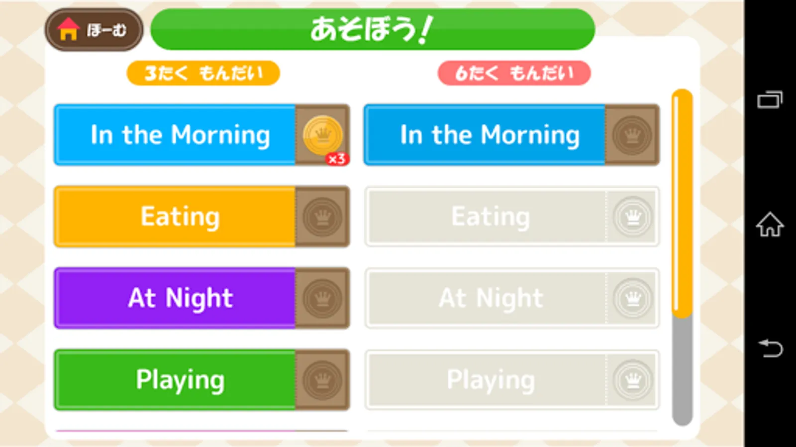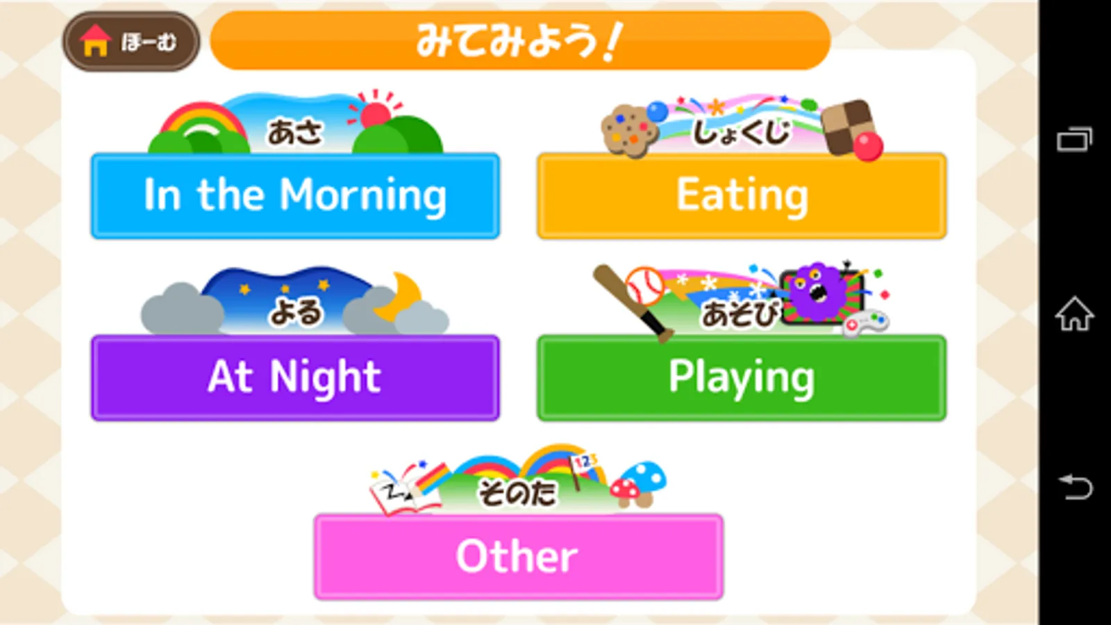 自然に英語を聞く力を身に付けるために、また、子どもたちが飽きないように、遊びの要素を盛り込み、目と耳から繰り返し学習できるアプリです。