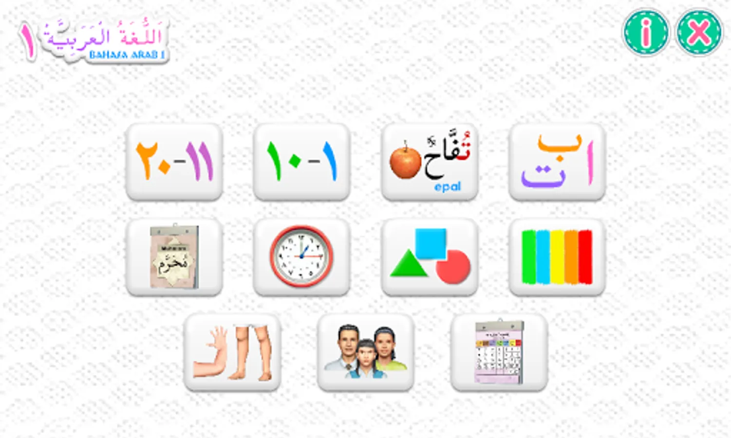 Belajar Bahasa Arab 1 dibangunkan supaya kanak-kanak dapat belajar huruf-huruf Bahasa Arab, nombor dan asas Bahasa Arab dengan cara yang menyeronokkan. Applikasi ini juga disertakan dengan latihan pengukuhan untuk menguji kemahiran mengenal perkataan dan sebutan Bahasa Arab.