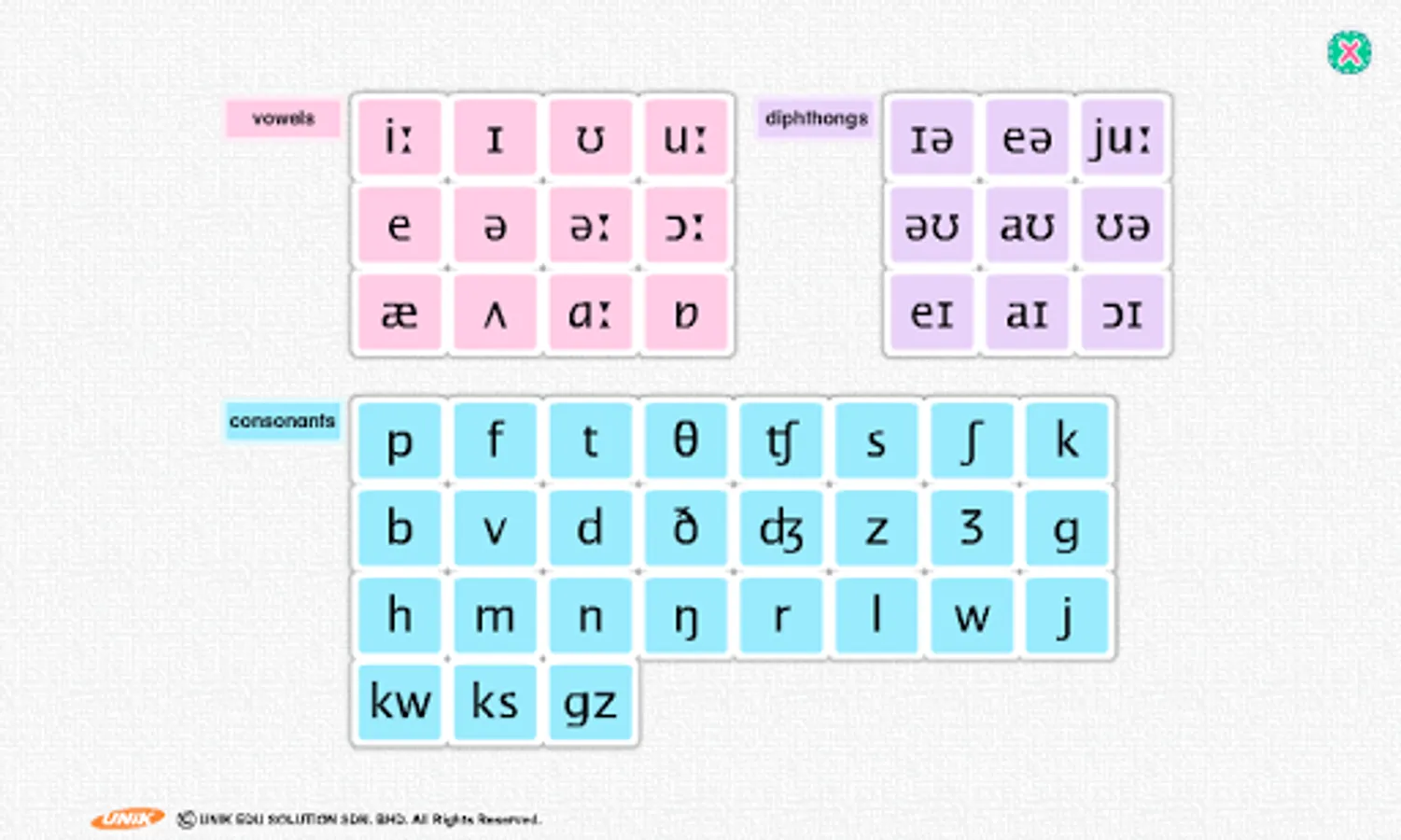 • ‘x’ has two sounds, namely, /ks/ and /gz/. These two sounds are not represented in the standard IPA chart; they are put here for the sake of completeness.