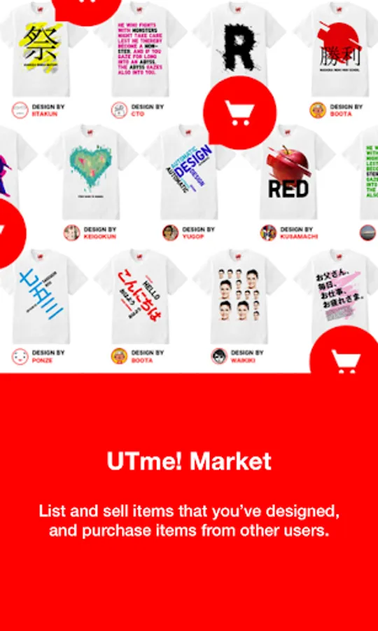 UNIQLO is introducing a new way to enjoy T-shirts. "UTme" is an application that allows anyone to create their own original T-shirt designs. Using it is easy, just draw a picture and shake your smartphone! When you're done, share your design, or sell your favorite designs in the UTme! market.