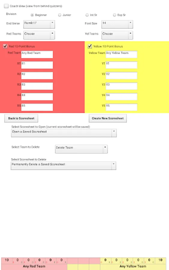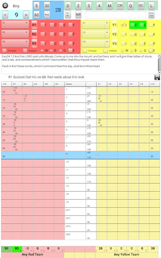 Scorekeeping with the app can handle everything that can happen in a quiz (timeouts, contests, fouls, overtime, etc). Calculations are automatic, eliminating virtually all calculation errors during score keeping. The difference between scores and the remaining points in the quiz are clearly displayed on the scoresheet. When a quizzer quizzes or errors out or are about to quiz or error out, his or her summary box at the bottom changes color to alert individuals to these events. Also, coaching hints are provided throughout the quiz, giving status updates and letting individuals know the quiz lock status (the moment at which a team has accrued enough points that the other team cannot overcome the point difference to win).