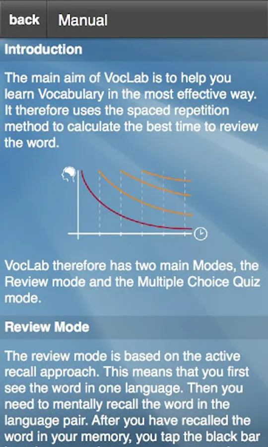 Voclab will gradually increase the difficulty of words to ensure that you gain first a solid foundation of basic words before learning more complex ones. This enables you to quickly gain a good understanding of the language.