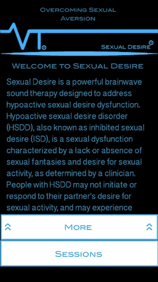 Sexual Desire is a powerful brainwave sound therapy designed to address hypoactive sexual desire dysfunction. Hypoactive sexual desire disorder (HSDD), also known as inhibited sexual desire (ISD), is a sexual dysfunction characterized by a lack or absence of sexual fantasies and desire for sexual activity, as determined by a clinician. People with HSDD may not initiate or respond to their partner's desire for sexual activity, and may experience sexual aversion or apathy.