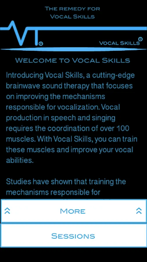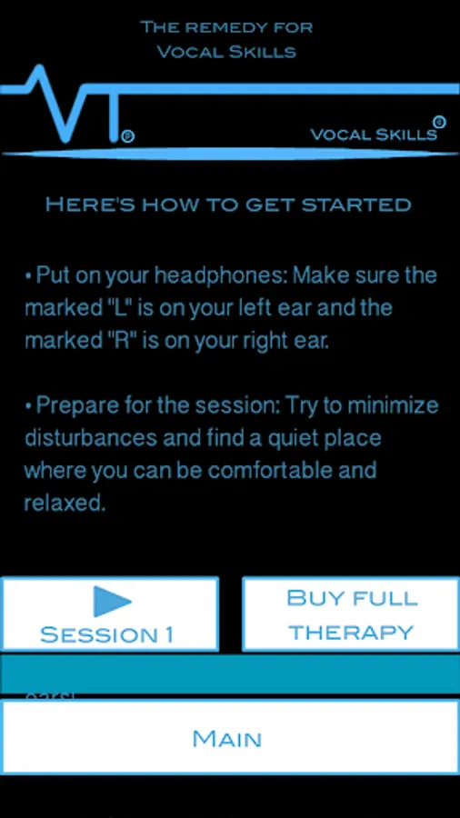 Vocal Skills consists of three different sessions, each lasting 22 minutes. It is important to complete all three sessions to achieve the full benefits of the therapy. We recommend using high-quality headphones or earphones with left and right placement correctly to get the best experience.