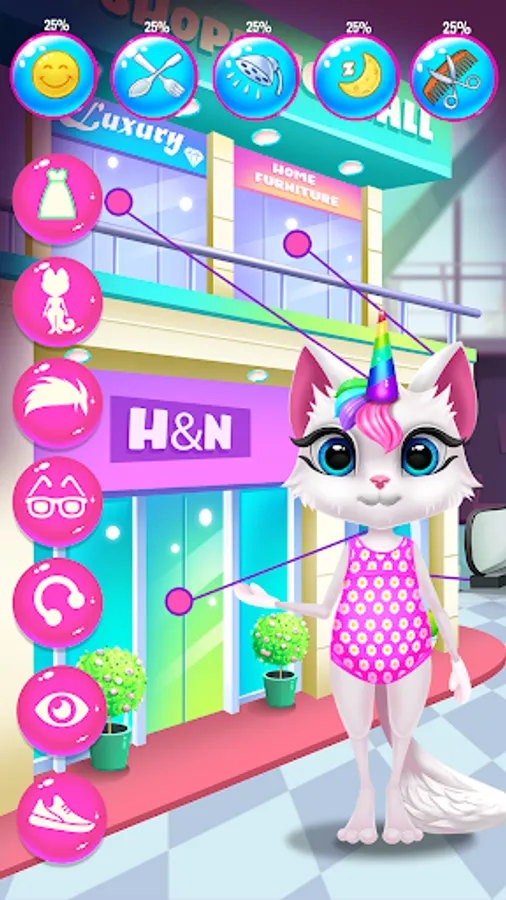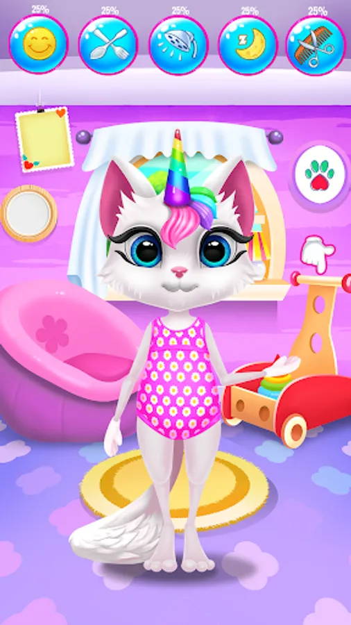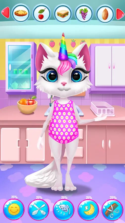 We came up with this animal game where you get to play with an adorable little cat that is also a fabulous unicorn. Your mission will be to groom her and also care for her. Not only that you will have fun playing the incorporated mini-game, but you will also spend a wonderful time with the unicorn kitty Kate. Start the day with a refreshing bath and make sure your pet is all washed up. Fill the bathtub and have her fur soaked in. Remove the dirt and rub her body with some soap. Rinse her and get the kitty ready for the hair salon. Here you get to change the way she looks. Clean her hair and then you can even dye it. Pick a hairstyle that you like and put on her rainbow corn as she is a unicorn kitty. You have a chance to spend some time in the playroom where your pet will play with her toys. Take her to the sports room where you will exercises. Learn the moves and have a fun activity together. It seems like she is hungry after all this playing. Go to the kitchen and cook a delicious meal for your kitty. Follow the instructions to get the recipe right and serve her with your fresh-baked food. Continue the day with the dressing part where you get to pick from a lovely collection of clothes. Match the unicorn kitty hairstyle with a cute dress or maybe a top with some pants. Add the proper accessories to complete her look. Kitty Kate wants to be fashionable and stylish, so you will help her personalize her outfit with a new pair of shoes. Enjoy the time left by playing this mini-game with Kate. Match the candies that come in the billboard and gain some gold. Have the best score and keep finding the perfect matches.
