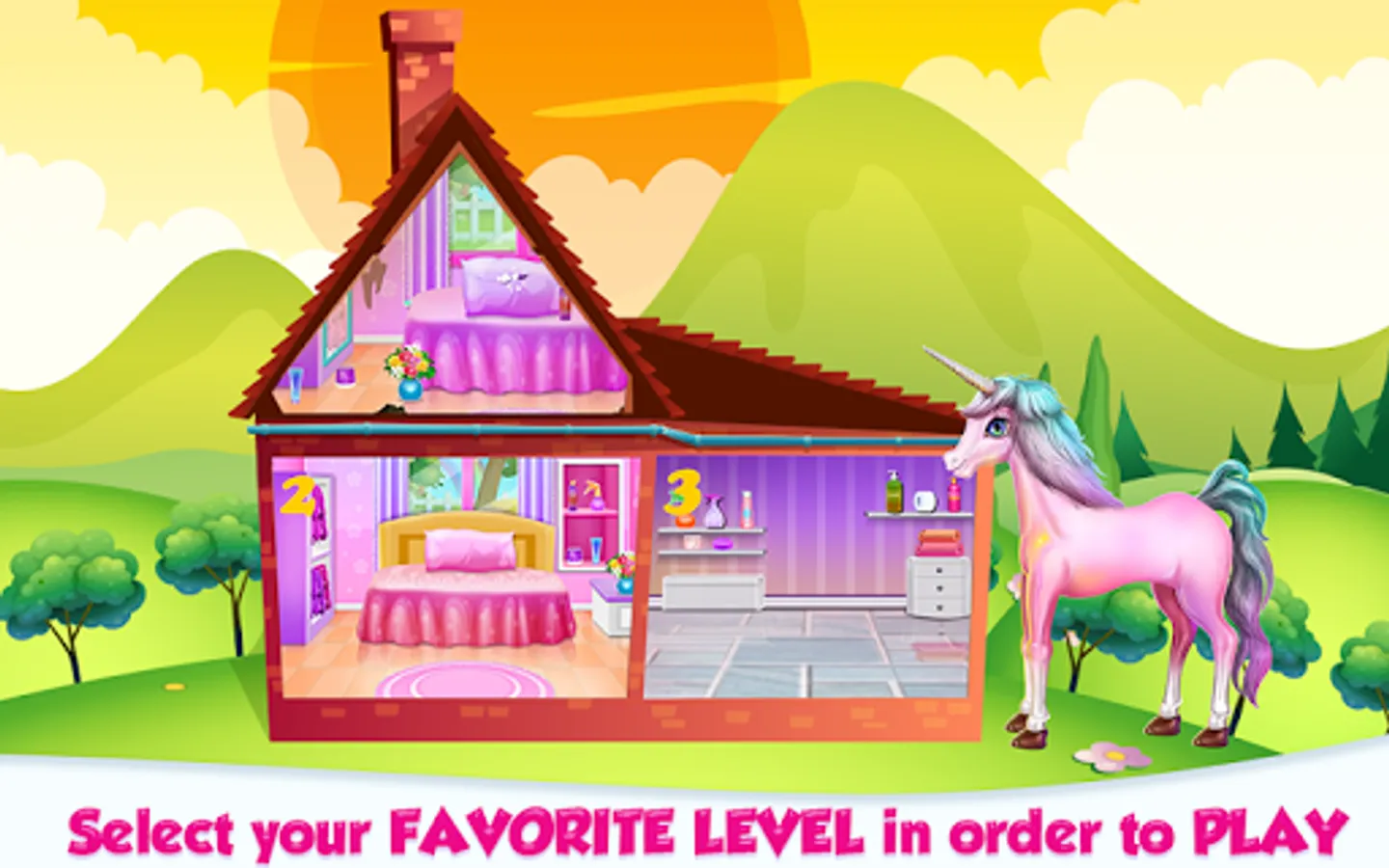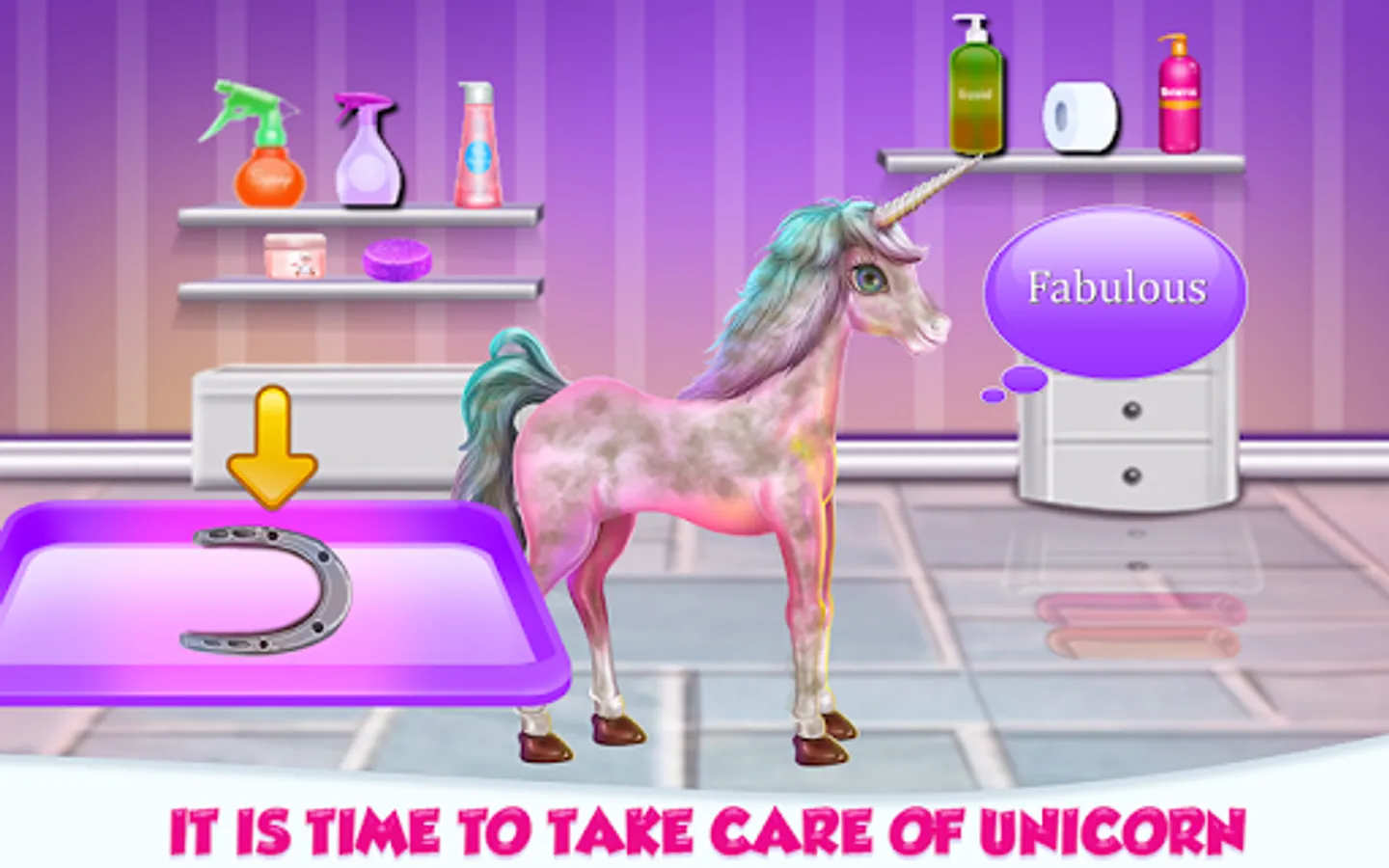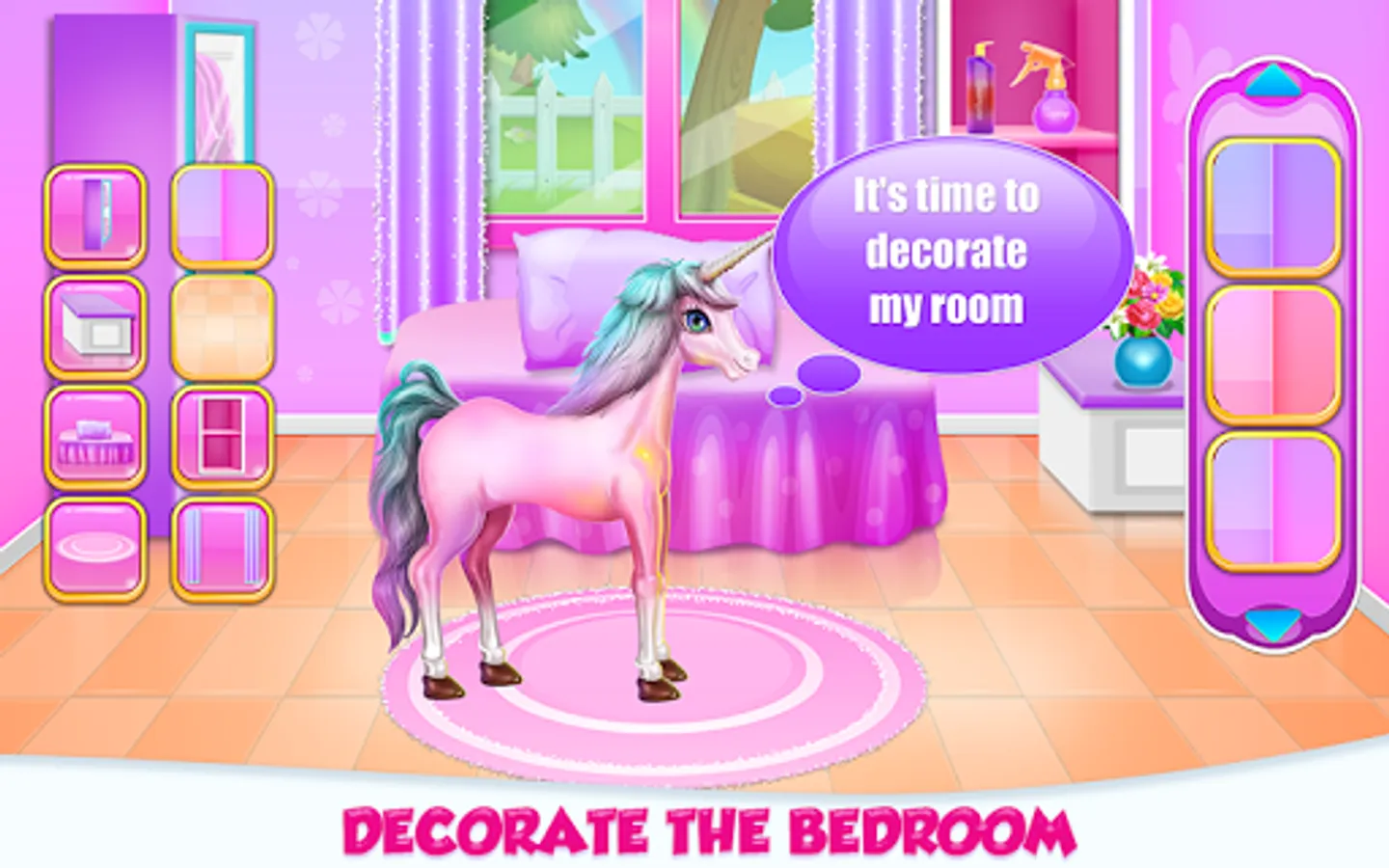 Have an unforgettable experience with this cleaning game and try to make it the perfect place for a unicorn to live in. Not only that you will wash the dirt out of it, but you will have a thing to say when it comes to decorating the room. You will clean the floors, remove the stains, throw the garbage and then get rid of those stinky leftovers that are spread all over the room. Also, there is so much spider web that must be wiped off and the misplaced objects must be put where they belong. The windows need a serious rubbing and the walls too. Have the room restored and continue your journey in this unicorn game with the decorations items. Use your creativity and design a beautiful new look for our little unicorn. Change the drawers, rethink the bed and add a different attire to the room's aspect. After all the hard word this colorful animal will need your care. Give him a good wash and be sure you get rid of that bad smell. The hooves must be changed right away with new ones. Follow the procedure for replacement and then check the medical state of our unicorn. If there are any internal or external wounds, you must treat them fast and make your patient painless. Now that the unicorn is feeling good and his home is all restored you can replay the game to try different ways to decorate its room.