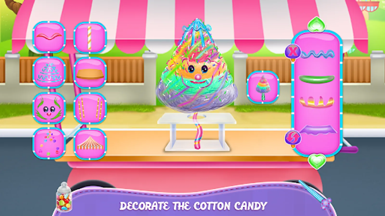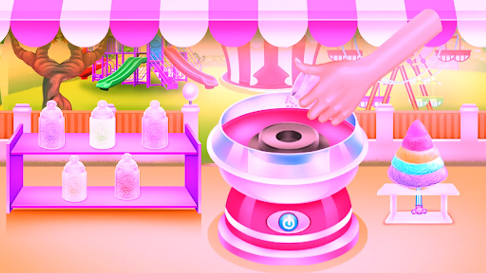 Try to follow each step of this cooking game and use the asked technique to see how difficult can be to make this kind of sugar cloud. The thing that stops you from succeeding is the part where you actually start your work and follow the instructions.There are some important rules to follow and different stages that need a special type of attention and dedication, make sure you get through all successfully and look at the instructions so you won’t destroy anything. Something cool is that you are making it from the ground and that is how you learn how to make it. First, you have to go to the store for supply and of course, you need to take all the ingredients from the list in order to complete your recipe. Play an interactive game where you collect the required flavored for this colorful cotton candy. Create the stick for the cotton candy then turn the machine on and add the colorful sugar in. Each color has a different flavor like the purple one tastes as blueberries or the orange one tastes as oranges and so on. Put each layer on to of the stick and when the pyramid is completed just move to the decorating part. You are assigned to be creative and add colorful details and if you would want to you could even put a funny animal character. Is up to you what style you adopt and how many sprinkles you incorporate into your prepared sweets.