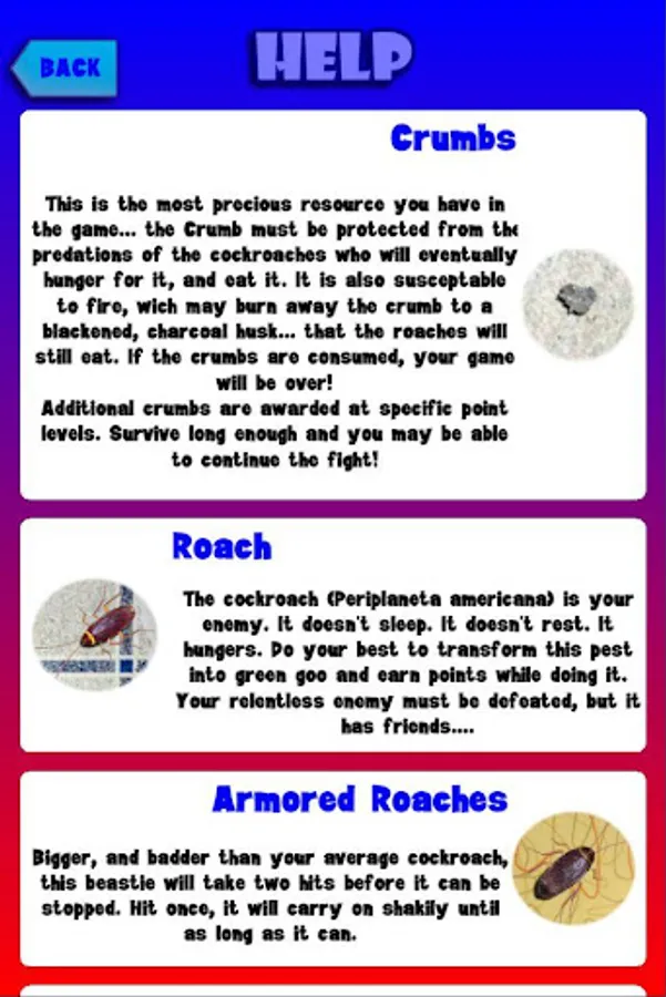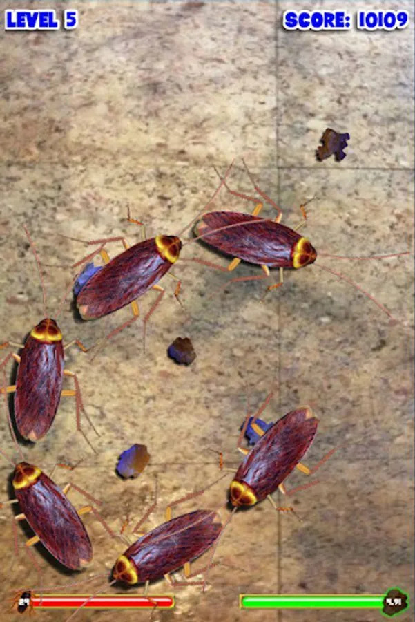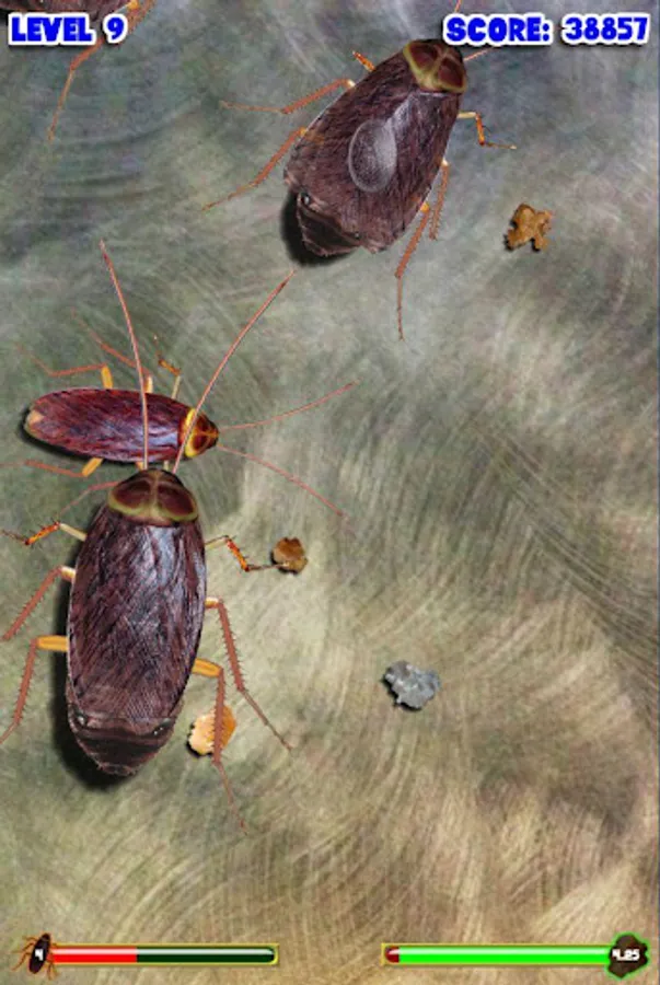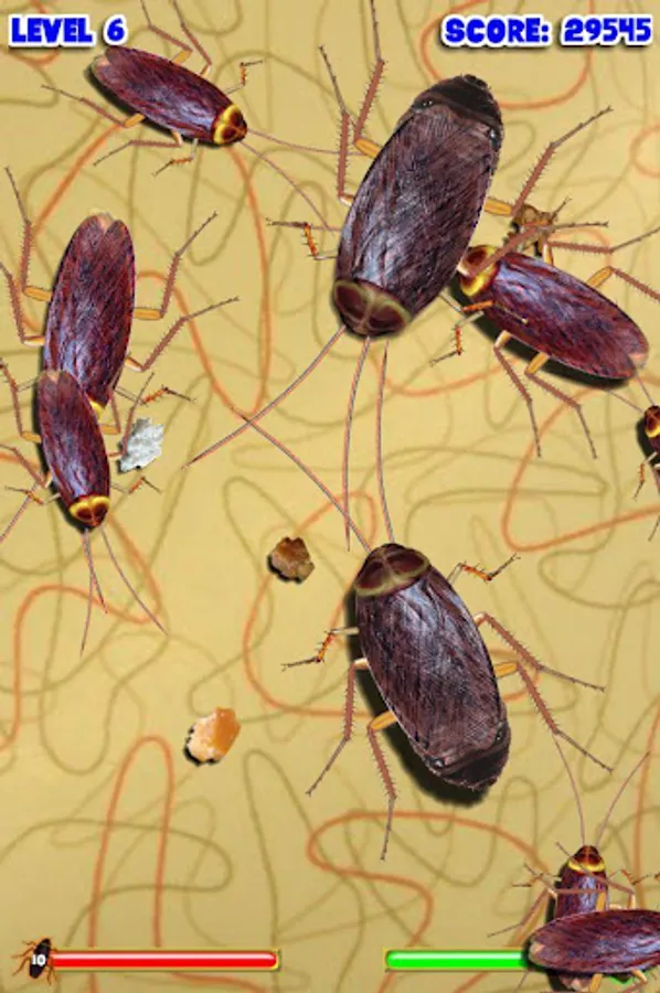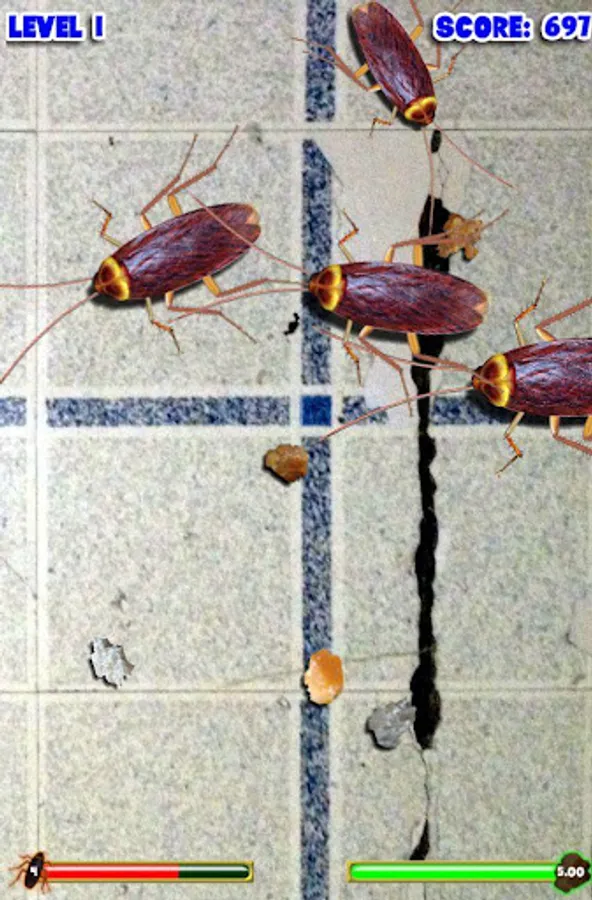 Pit your thumb-smashing skills against the hordes of roaches that will attack your morsels when their hunger grows. Be aware, though, not all the cockroaches in this game are pushovers (or is that 'squish overs'?) - there are even rumors of irradiated bugs that can cause a bigger risk to your crumbs than simply being eaten. If you succeed in vanquishing your foes, you will be given the opportunity to annihilate waves of roaches as they skitter in formation, in a tribute to those classic 80s arcade games. Can you make it to level 50? It will take quick, accurate strikes and strategic targeting to clear the board in more advanced levels.
