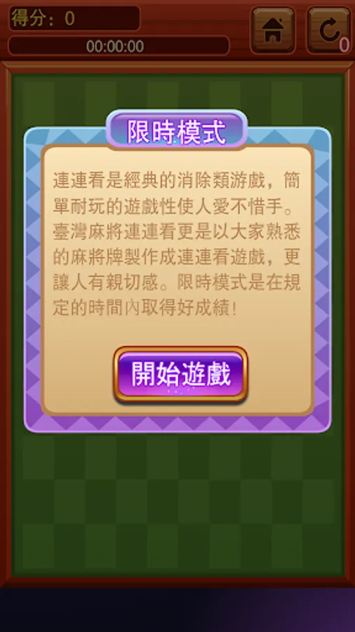 Lianliankan is a classic elimination game, simple playable game of make love at hand. Taiwan Mahjong is a more familiar tiles made into Lianliankan game, even more intimacy. Game carve limit mode, endless mode. Time Attack Mode within the stipulated time, challenge themselves, get good grades. Endless mode is more casual, you can freely enjoy their leisure time.