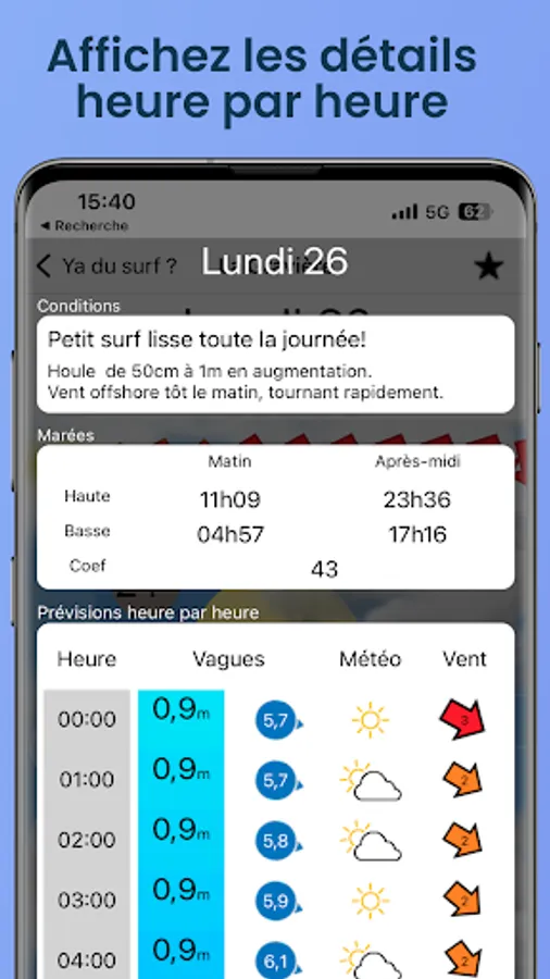 "Tap" on the screen and you will see additional information such as a text description of the weather conditions, as well as a table giving hour by hour and figures the height of the swell, its period, as well as the direction and the wind force.