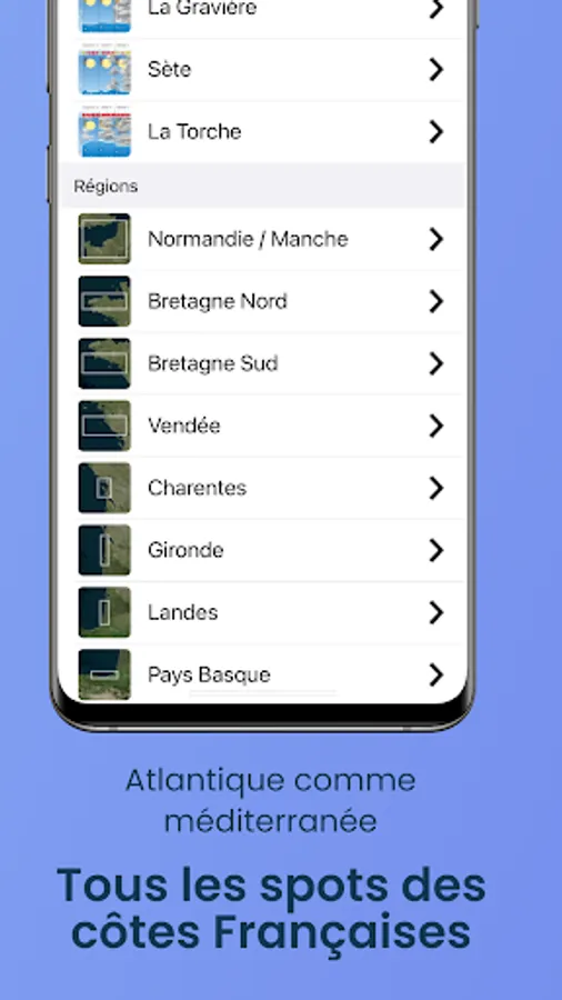 - Access to several hundred spots, spread over 10 areas (8 on the Atlantic, from the Channel to the Basque Country, plus 2 in the Mediterranean).