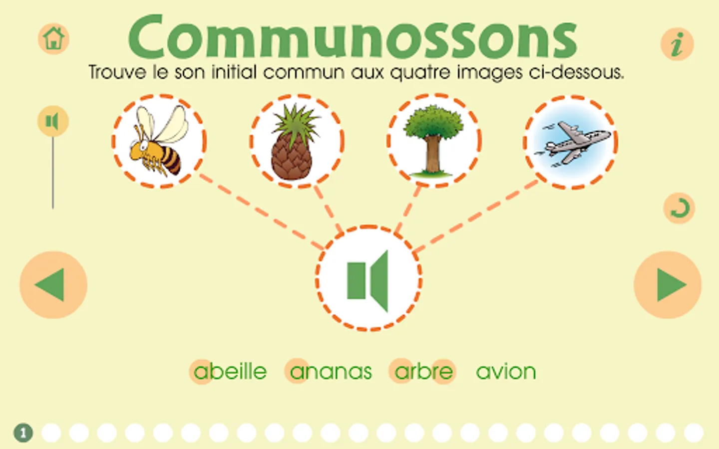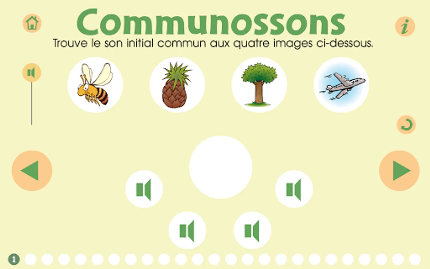 The application contains 25 exercises built on the same model. In this game, the user must recognize the initial sound of each word, then mentally isolate it. After hearing each word by touching them, he chooses which of the sound icons corresponds to the initial syllable of the words. He then slides the icon of the correct answer into the white circle. In case of error, a negative signal appears. If the sound is the one wanted, a bell ends the exercise. We can then move on to the next exercise. For more enjoyment, it is suggested to make this game with headphones and a stylus.