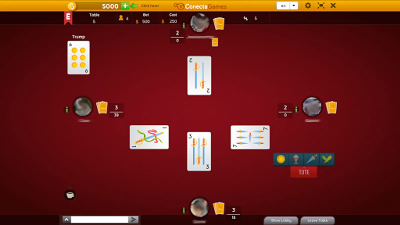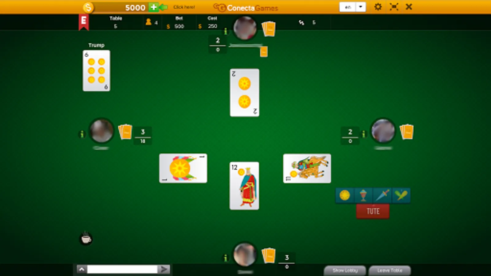 Tute Cabrero is played by 3 to 5 players, all against all, there are no teams.