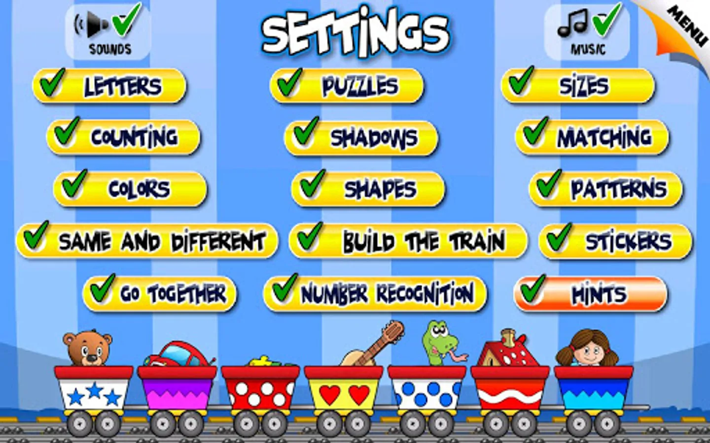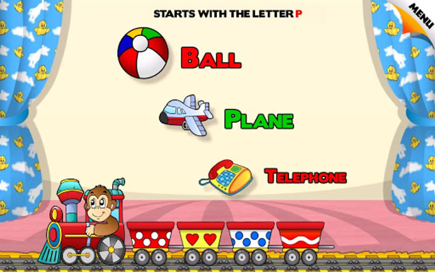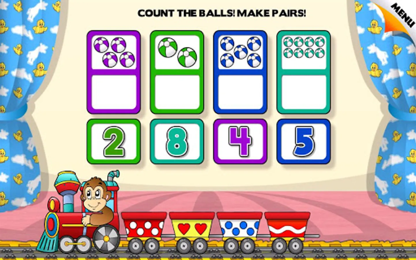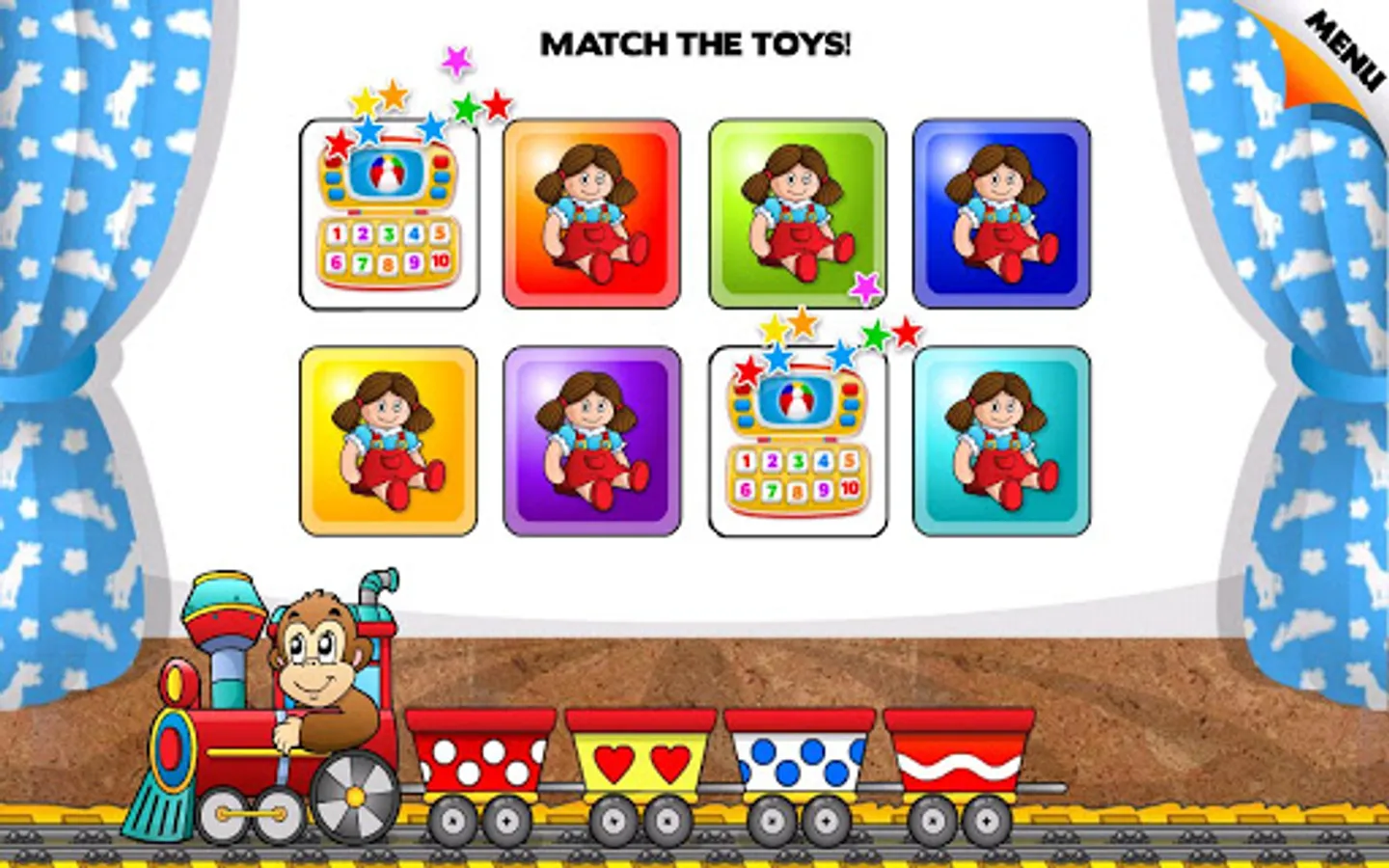 The ENTHUSIASTIC MONKEY CHARACTER is going to guide children through the whole game. As a reward after each round, children receive the opportunity to become creative artists and CHANGE THE DESIGN OF THE TRAIN, or obtain STICKERS TO SHOW OFF ON THEIR BOARD!