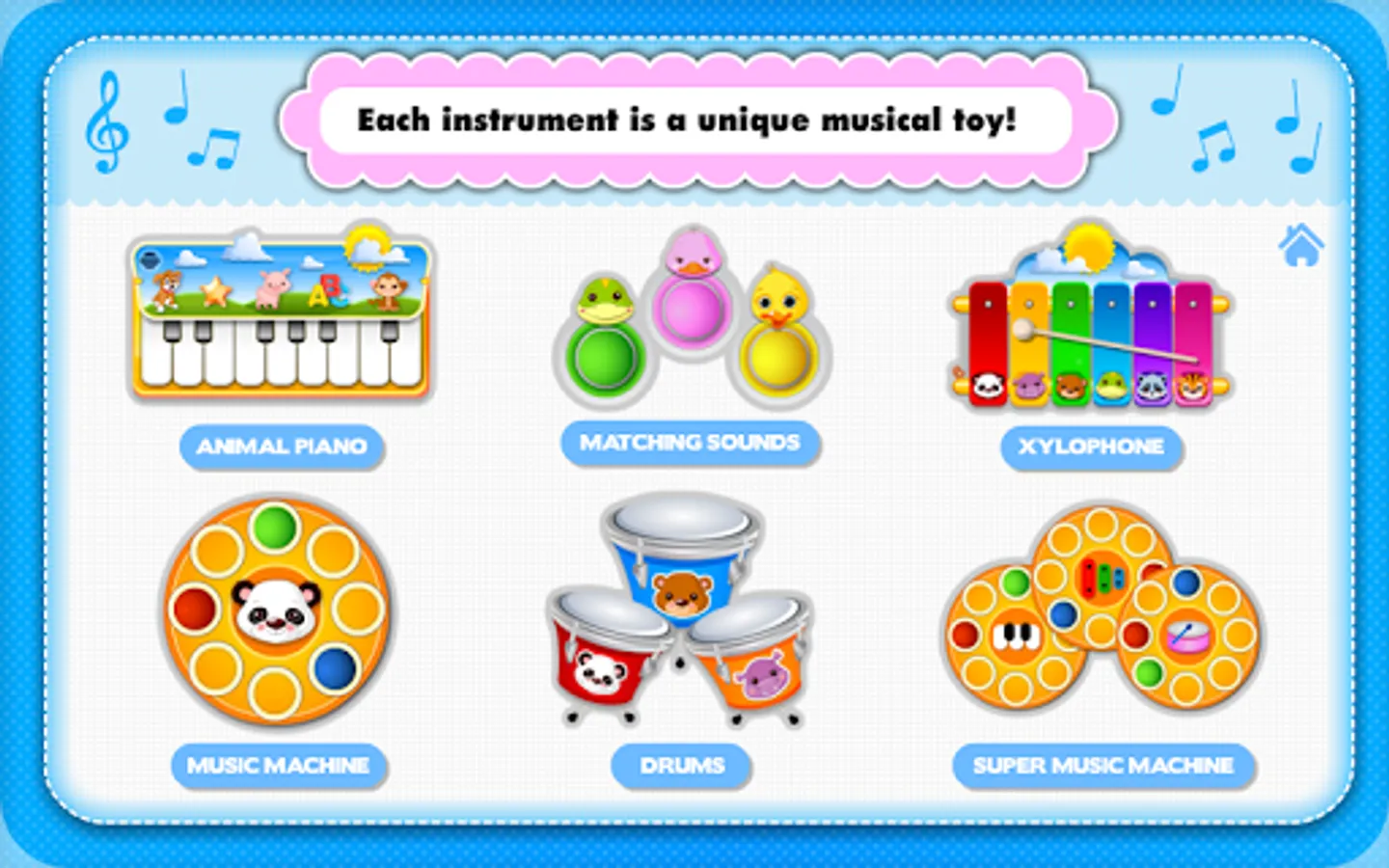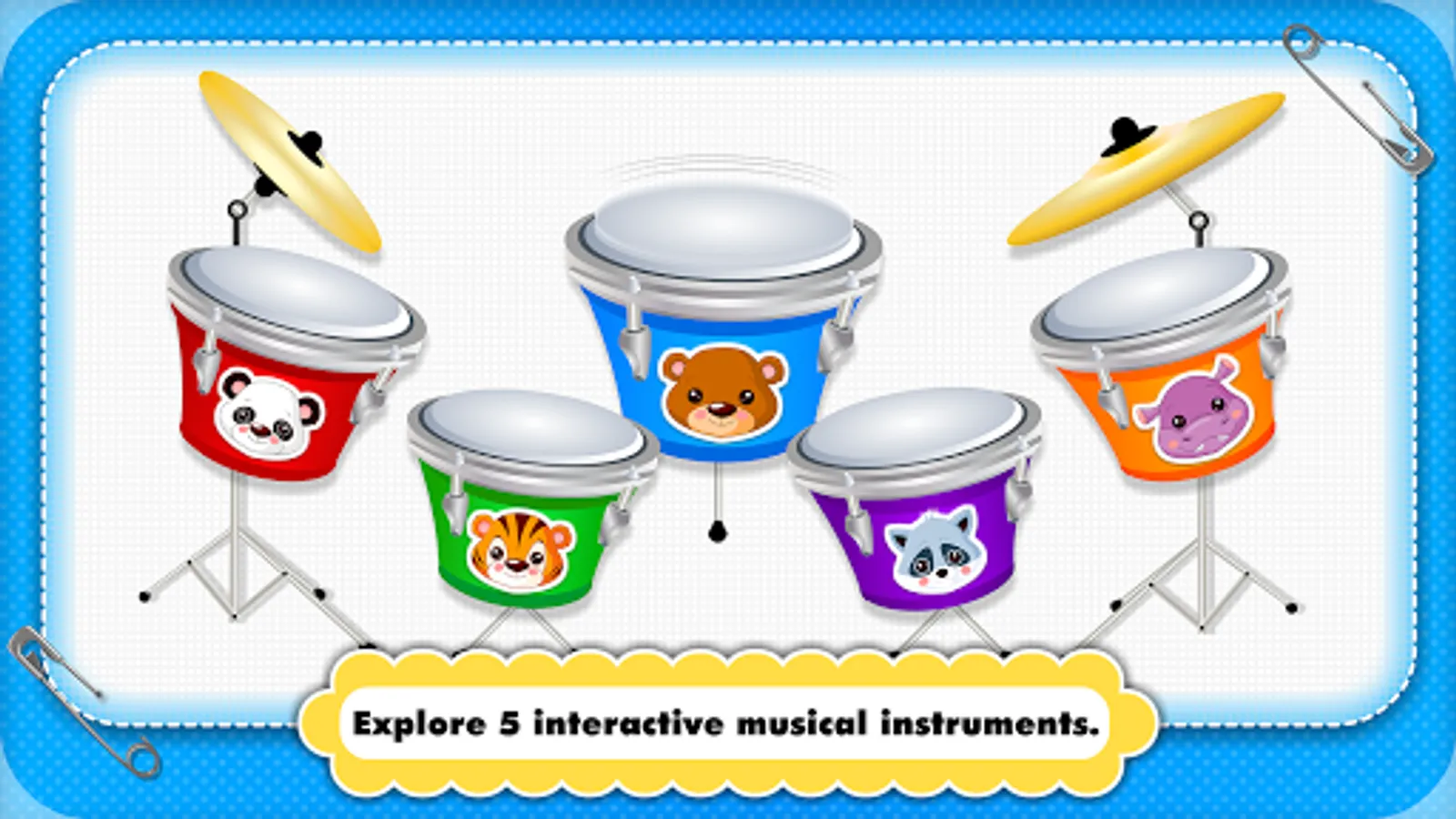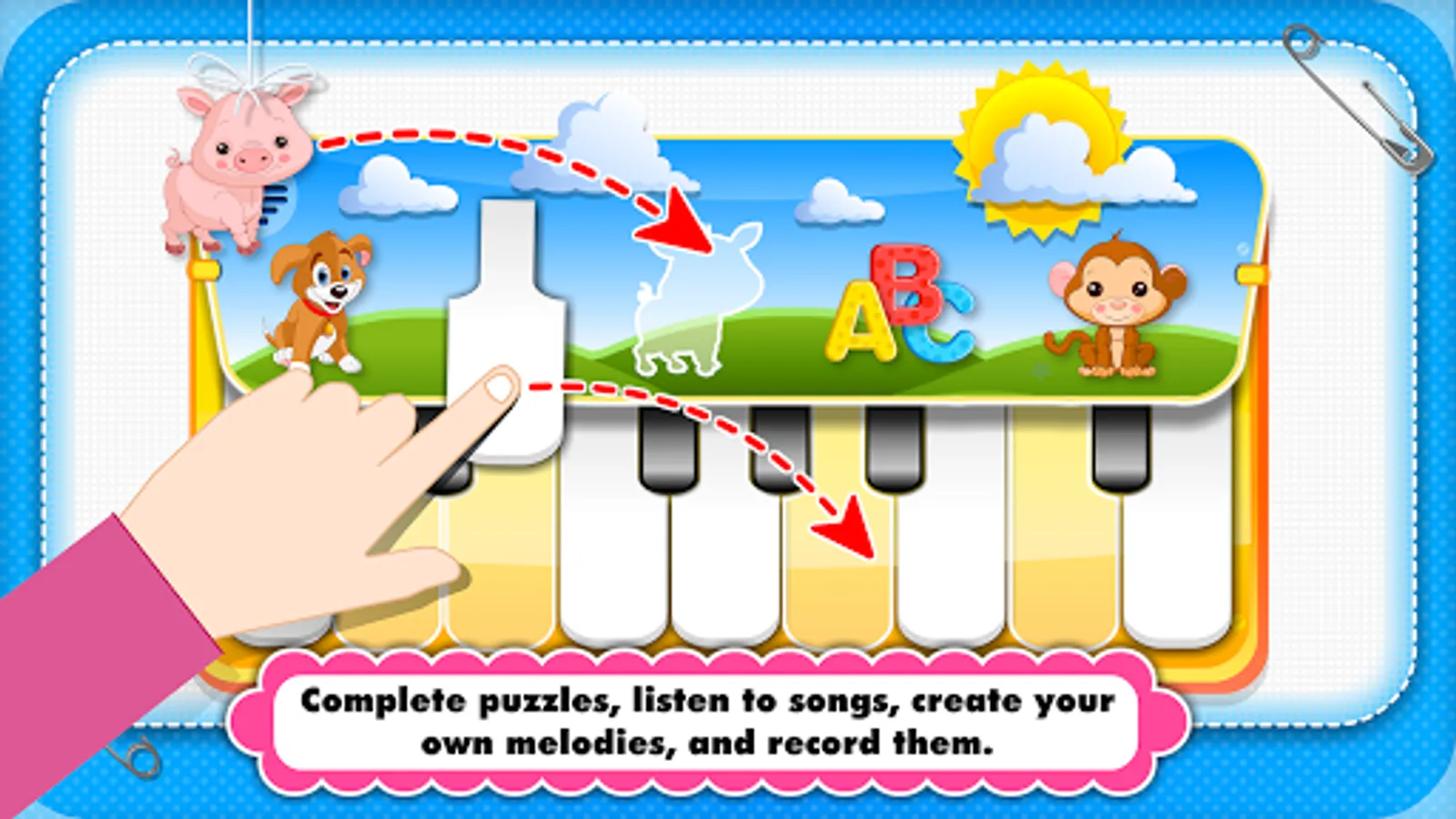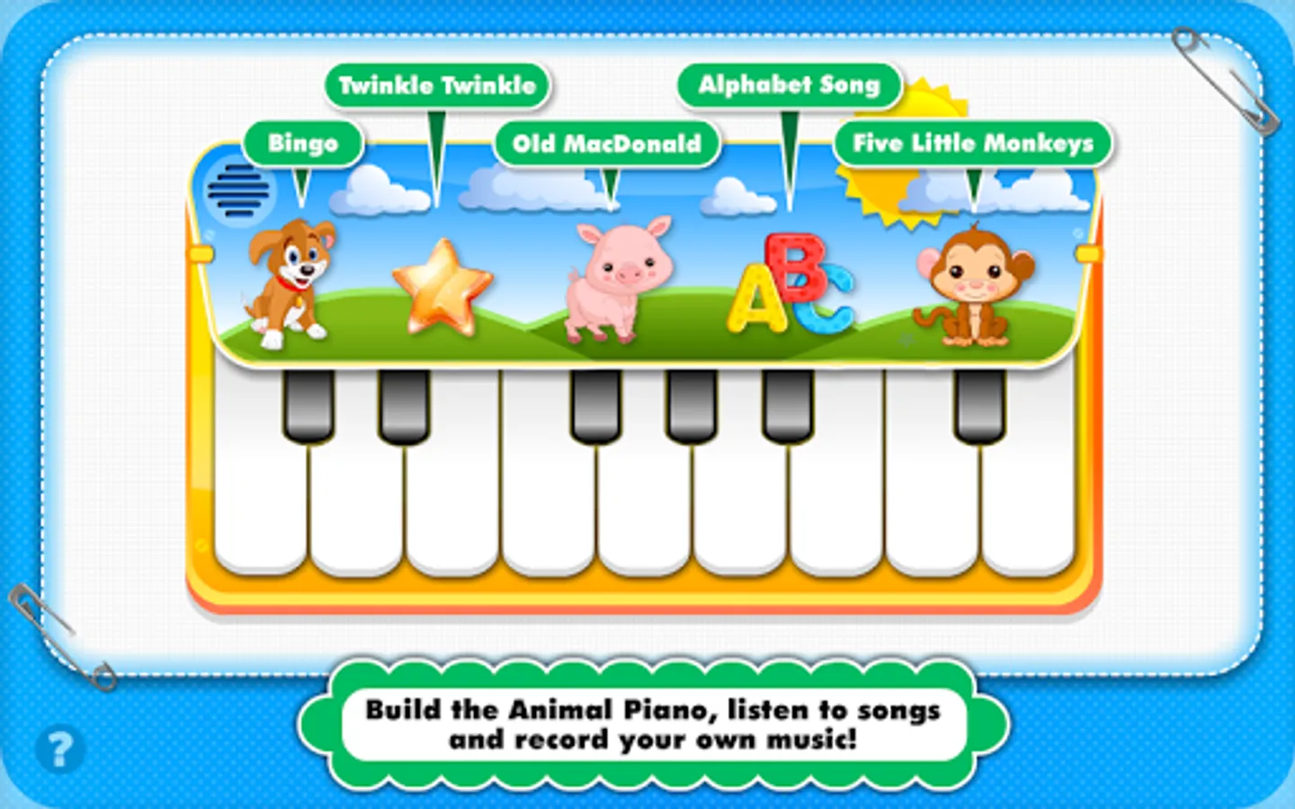 Play the piano. Record your music. Listen to classic childhood melodies, including Old MacDonald, Twinkle Twinkle, Bingo, Five Little Monkeys, and Alphabet Song.