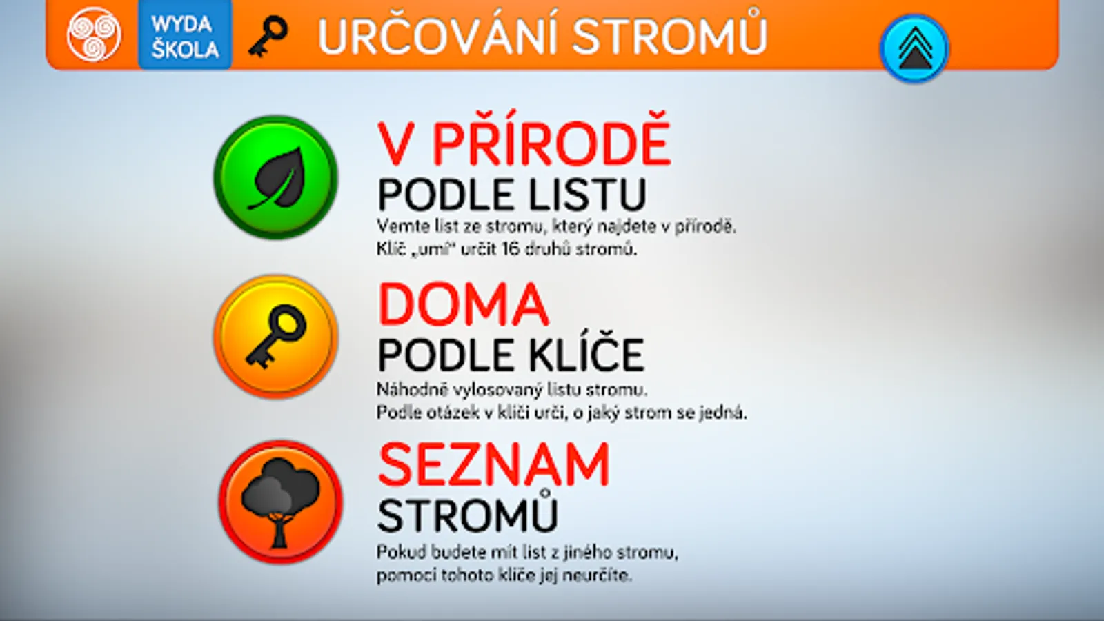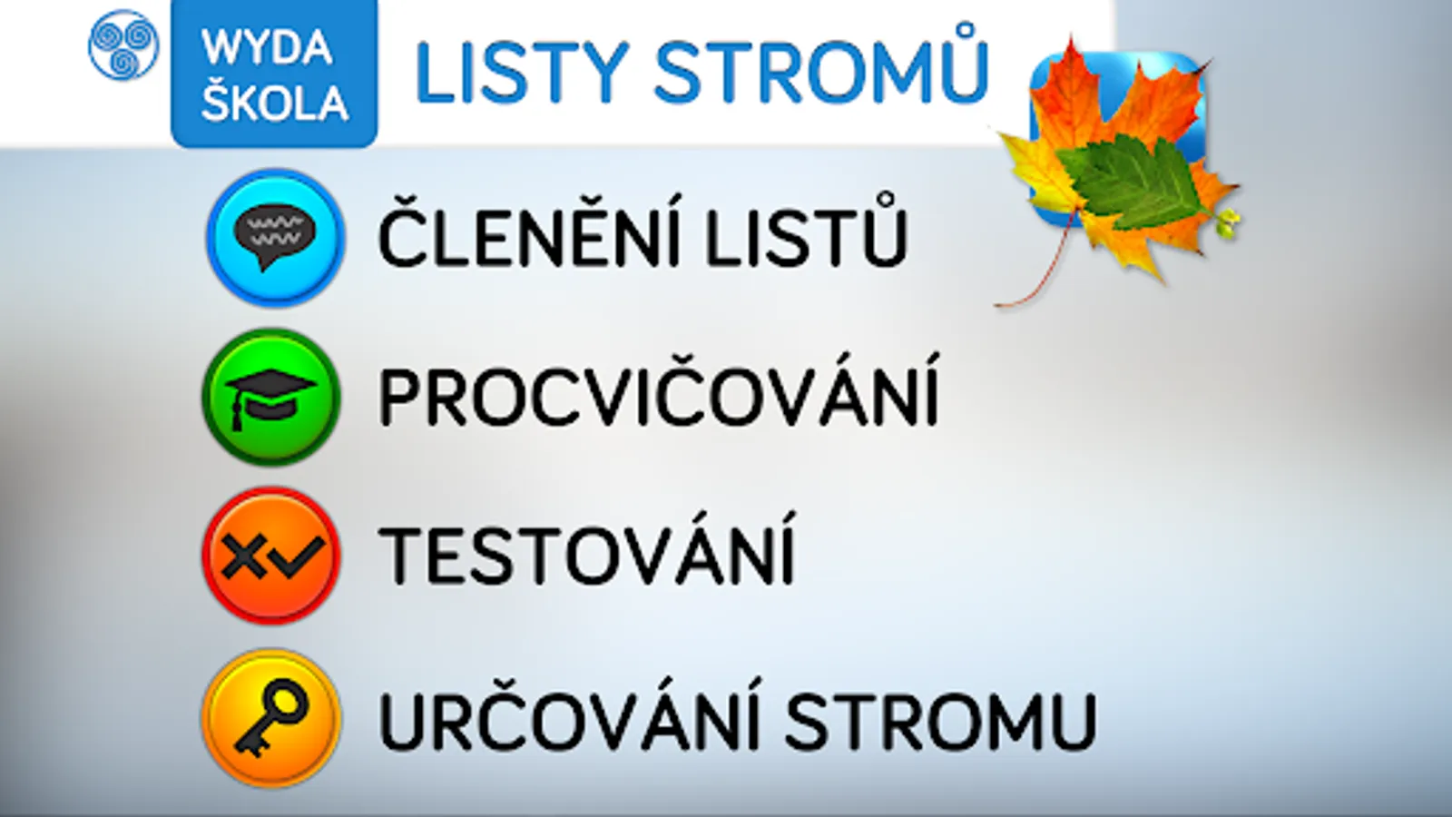 The comprehensive application from the new Wyda school series will teach you everything about leaves and help you easily get to know the trees growing in the Czech Republic. The application is suitable for the first stage of primary school, the second stage of primary school and for home tablets.